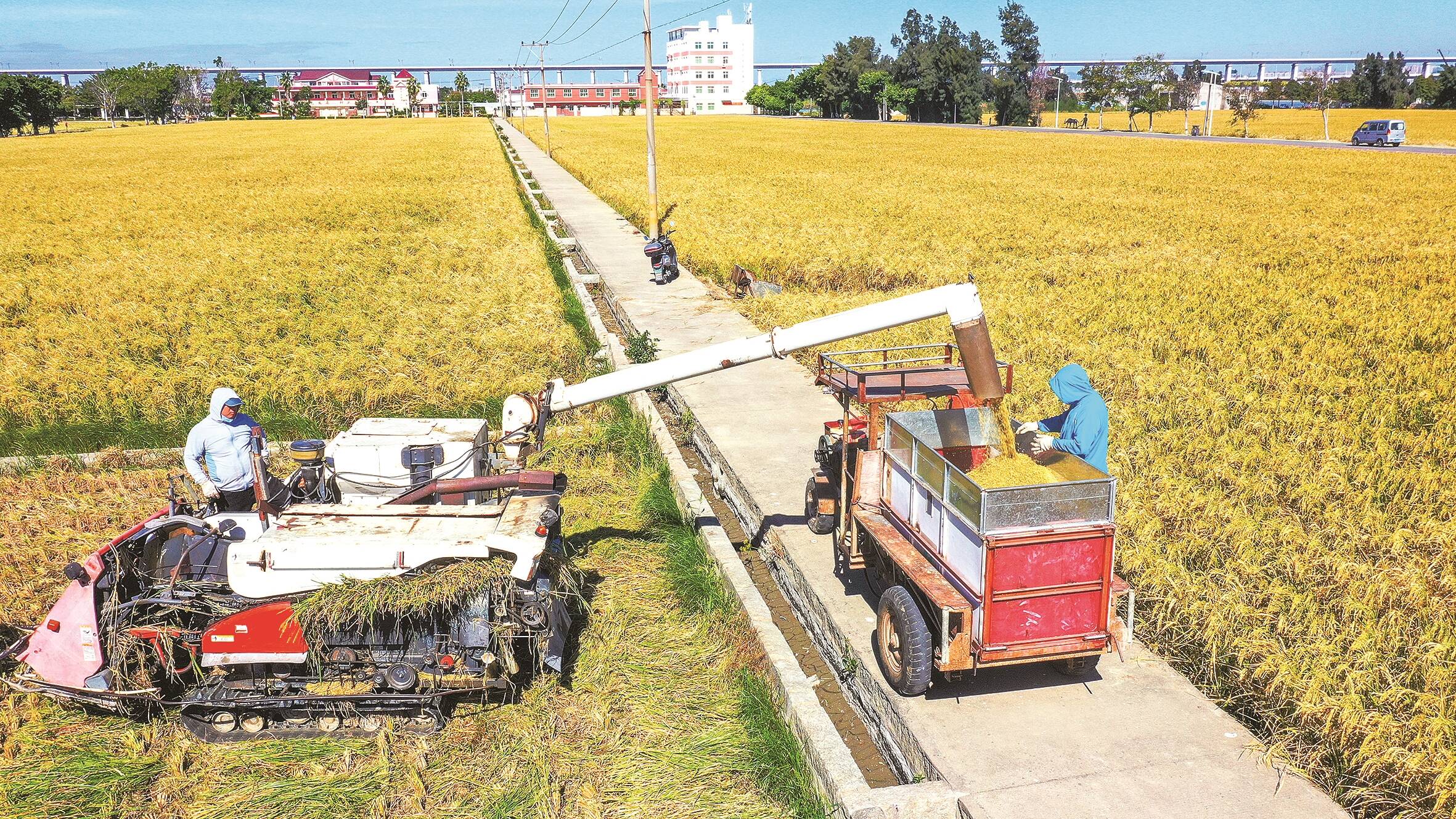 11月9日,我市晚稻收割正式拉开序幕。在石狮市湿地公园内,稻田铺就金色画卷,稻浪翻滚、满目金黄,饱满沉坠的稻穗压弯了稻秆,在微风中掀起层层金浪,每一粒稻谷都裹着阳光的暖意。稻农驾驶着收割机穿梭其间,娴熟地进行收割作业,轰鸣声中,成片稻田迅速完成脱粒归仓。一旁的拖拉机早已装满金灿灿的稻谷,正驶向晒场进行晾晒,奏响丰收的序曲。(记者 颜华杰)