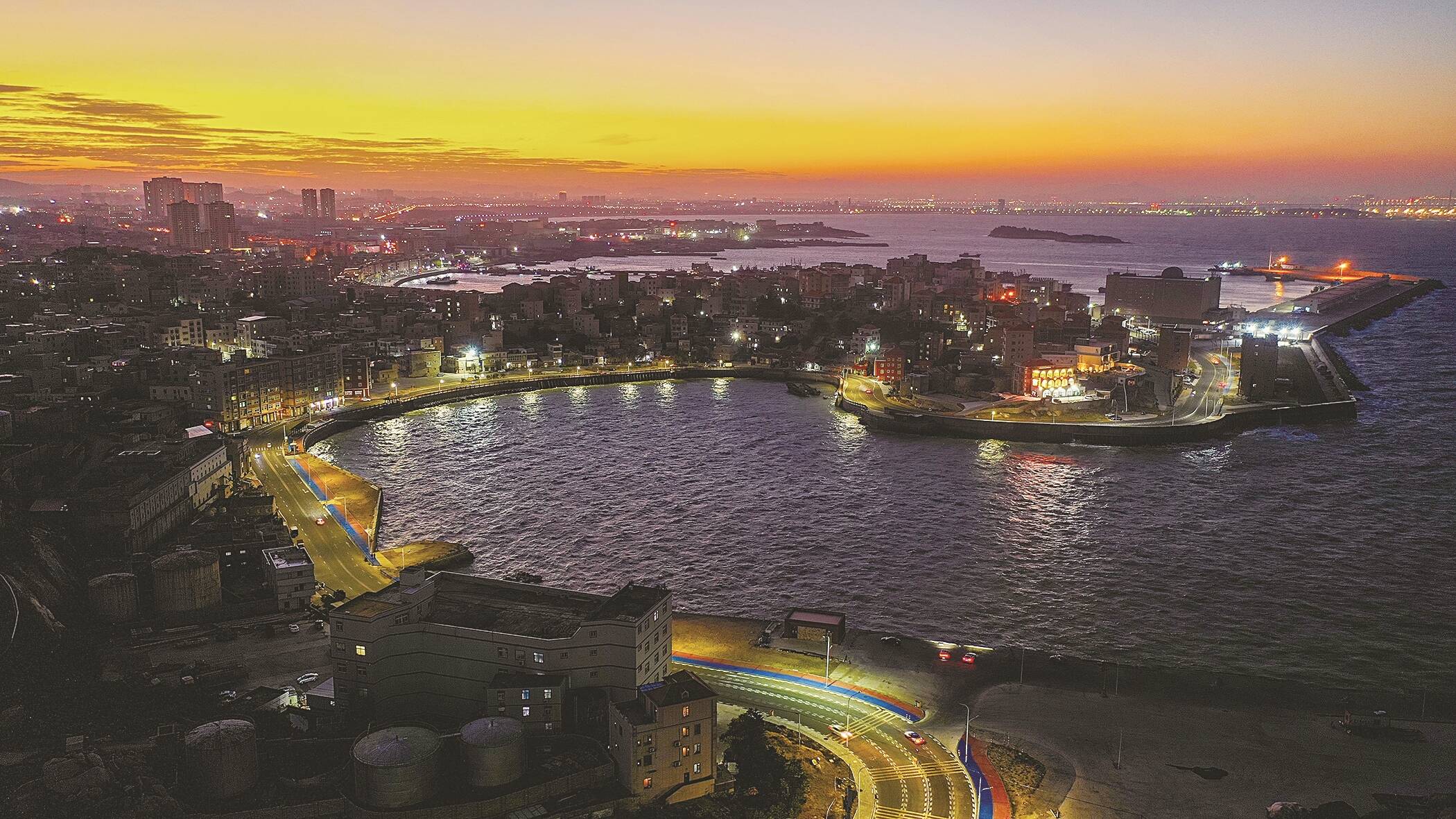 黄昏时分,夕阳为天际染上暖黄。公路上的路灯亮起,连成一条金色光带,与渐暗的天色相映成趣。祥芝国家中心渔港内,渔船上的灯火点点亮起,与公路上流动的车灯光轨交织成网,光影错落间,山海、公路、渔港融为一体,勾勒出一幅静谧而温暖的滨海夜曲图。