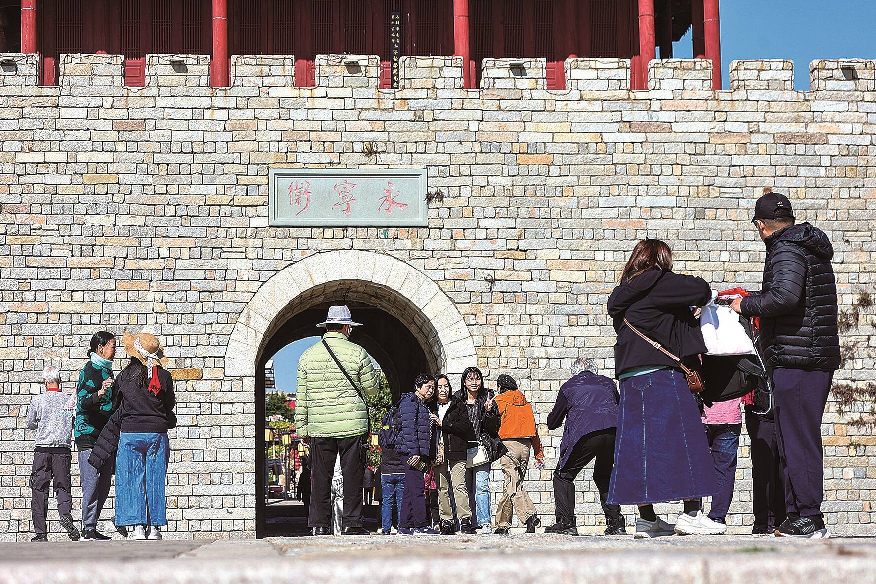 1月14日,天气晴好,众多游客到永宁古卫城游玩,城门前、老街上、番仔楼前,随处可见驻足打卡拍照的游客。(记者 颜华杰)