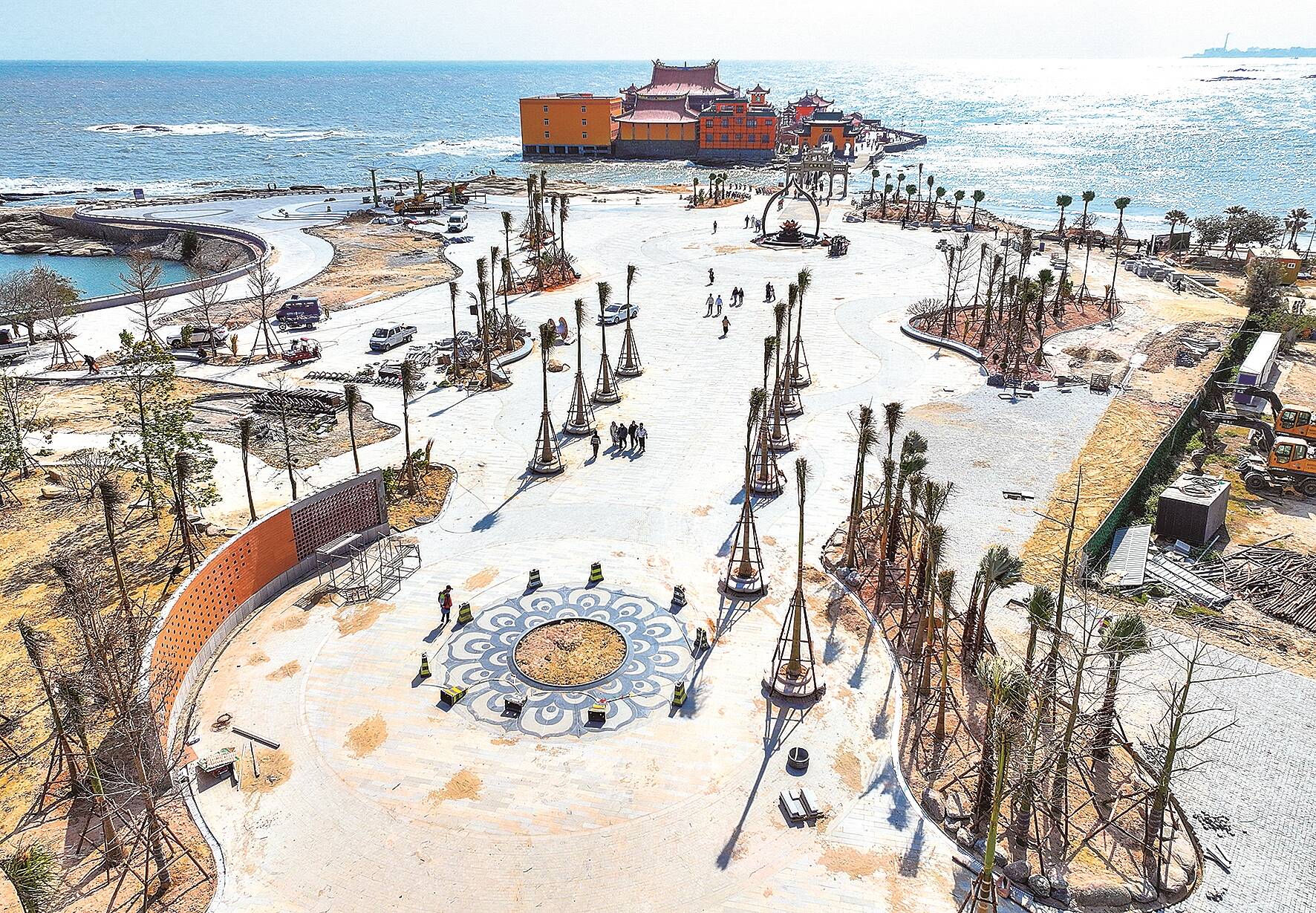 据悉,该项目广场总用地面积达21920平方米,以“礼佛—观海—悟禅”黄金动线为设计核心,规划建设民俗演艺广场、文化体验区、景观小品及休闲廊架等多元业态,致力于打造集旅游服务、文化体验、生态休闲于一体的禅意文旅综合体。目前,广场哑光面浮雕铺装、碎石平整、土方整平及水泥垫层浇筑已全部完成,苗木种植顺利收尾,地埋灯、多功能中杆灯及智慧路灯安装就绪,火焰背光造型雕塑组合与艺术廊架成品安装完毕,兼具禅韵与滨海风情的景观风貌已初步呈现。