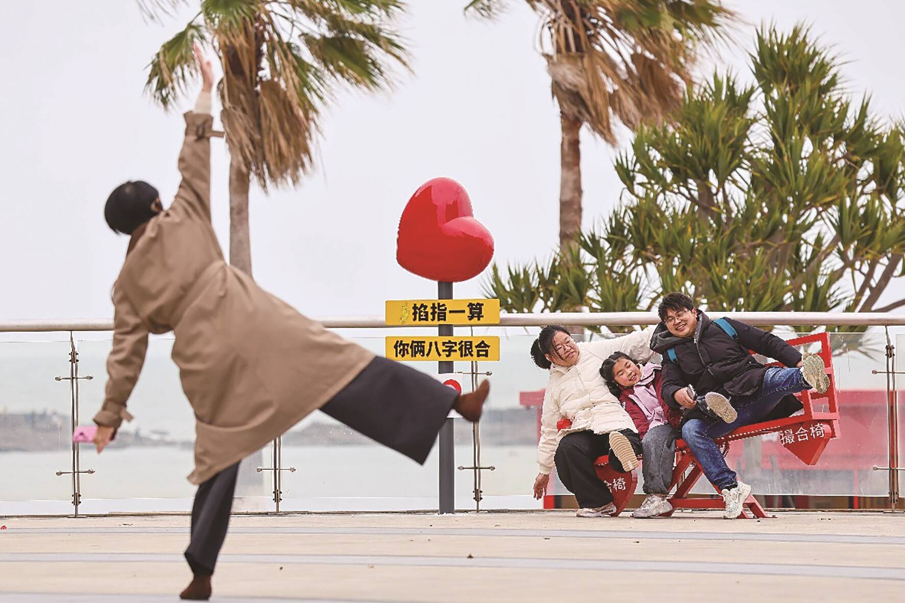 1月29日,记者在黄金海岸看到,来自上海的王女士一家三口正在撮合椅上合影。“永宁的海景开阔绝美,是在上海难得一见的景致。”王女士点赞道。据悉,撮合椅以“你俩八字很合”为寓意,双座相连且暗藏机关,可通过倾斜弧度让两人自然靠近,兼具互动性与观赏性;兔耳朵遮阳伞则融入闽南吉祥文化,寄托平安喜乐的期许,为沙滩增添色彩与活力。