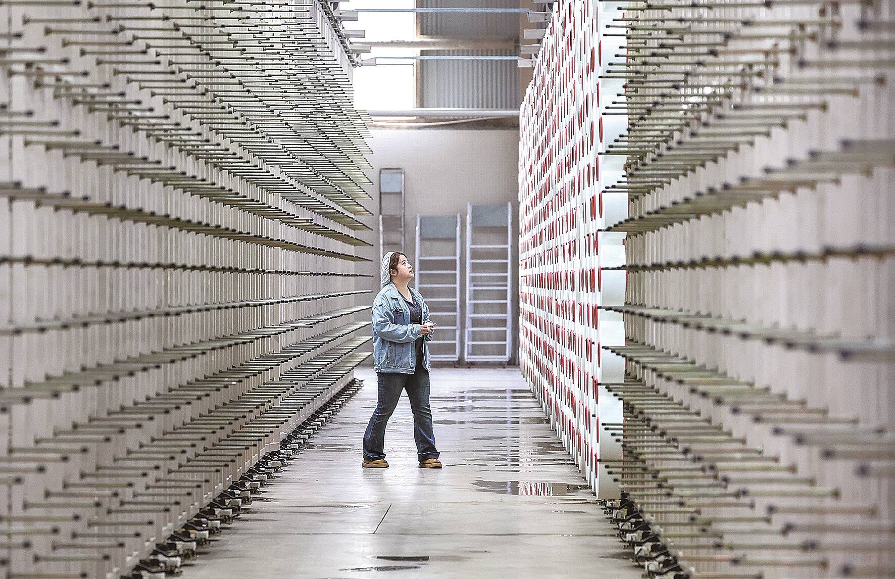 据悉,泉州市百川彩纺科技有限公司是中国长丝织造协会理事单位,该企业聚焦节能环保,使用回收PET瓶制成的再生涤纶长丝,并采用无水着色技术制造喷水织造布,显著降低纺织业的能耗和污染物排放,成为集科技、低碳、绿色于一体的“再生无水着色纺织品示范基地”。图为百川彩纺织造车间生产场景