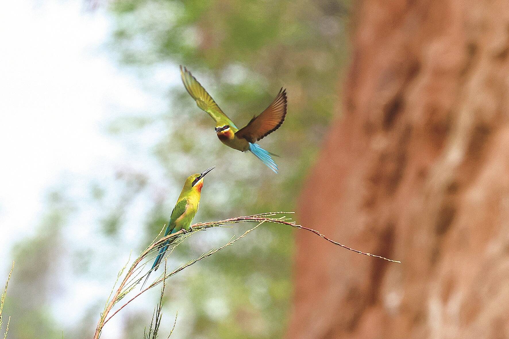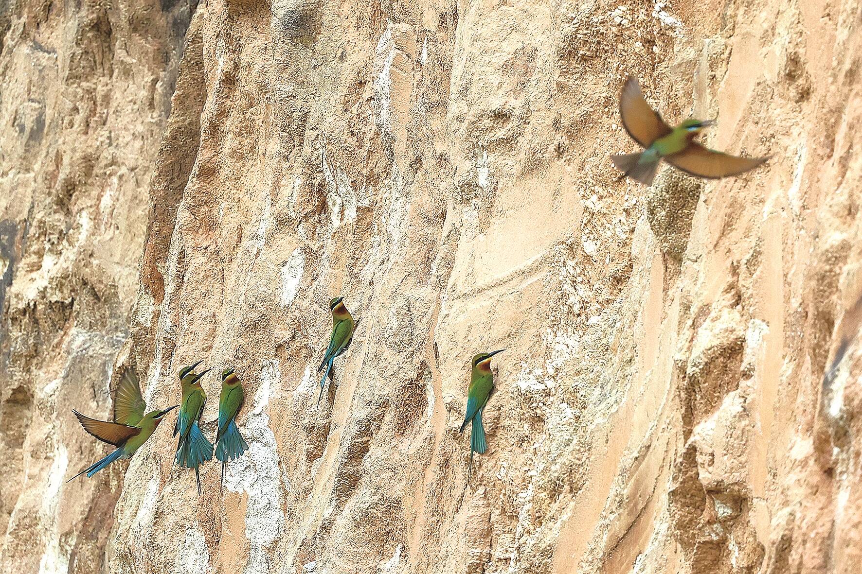 “眼下,栗喉蜂虎尚处休整、选址阶段,本月中下旬才开始筑巢繁殖。”泉州市观鸟学会会长吴轲朝分析,栗喉蜂虎长途迁徙后,会先在峡谷旅游路周边觅食补充能量,预计后续数量会继续增加。据悉,在去冬今春实施的石狮市第二轮栗喉蜂虎保护项目中,监测到峡谷旅游路土崖有132个成巢,表明去年约有132对蜂虎(一夫一妻制)在这里筑巢繁殖。