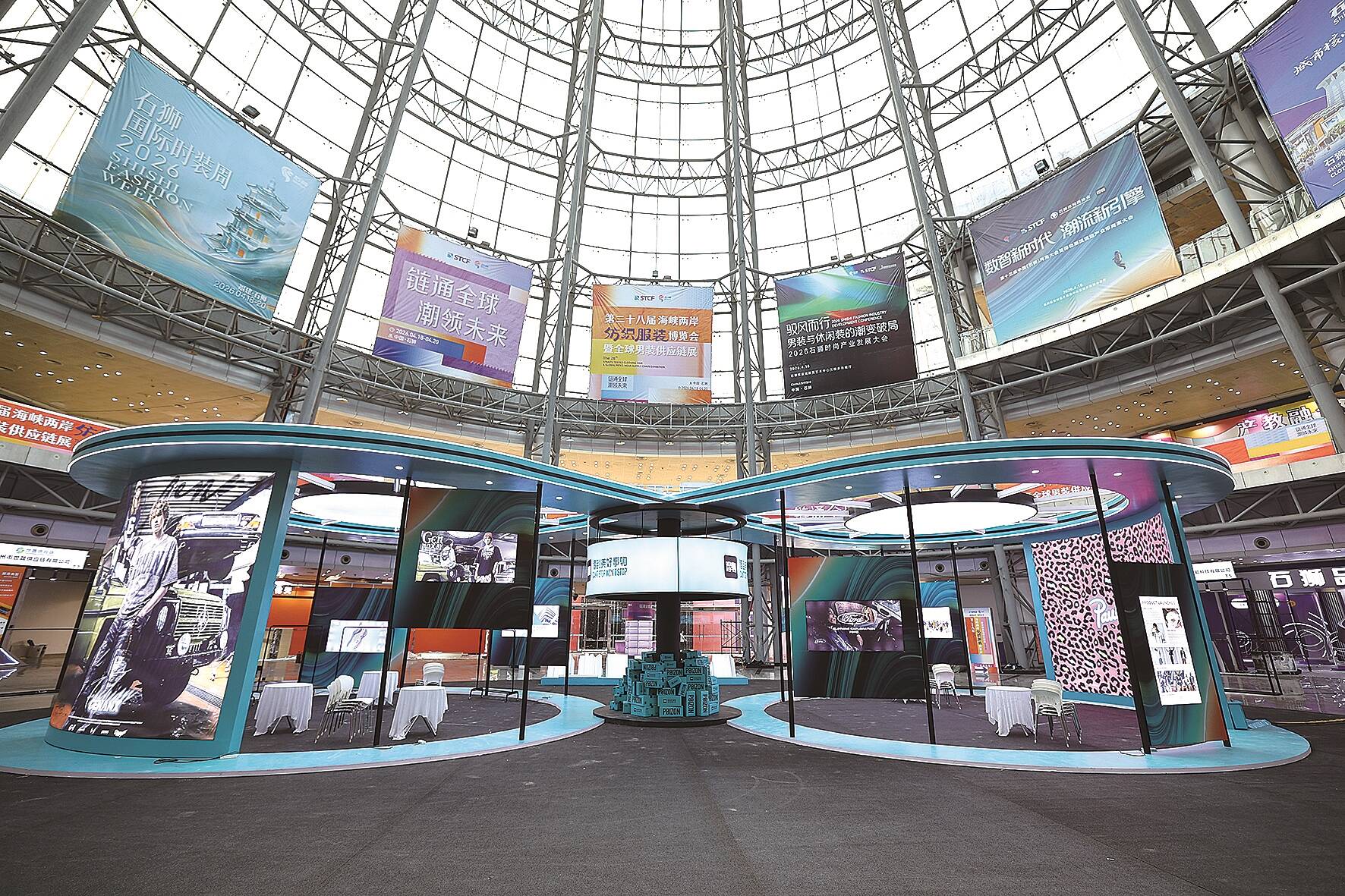 在石狮服装城展览艺术中心内,布展工作正有序推进。面辅料融合馆内,以彩色线轴为设计元素的装置错落而立,工人正在进行细节打磨;流行趋势馆、跨境选品区等展区搭建进入尾声,“得物潮流智造馆”蓝绿主色调的展区已整体亮相,尽显时尚质感。场馆外,色彩明快的主题门头已搭建完成,“链通全球 潮领未来”的标语醒目亮眼。