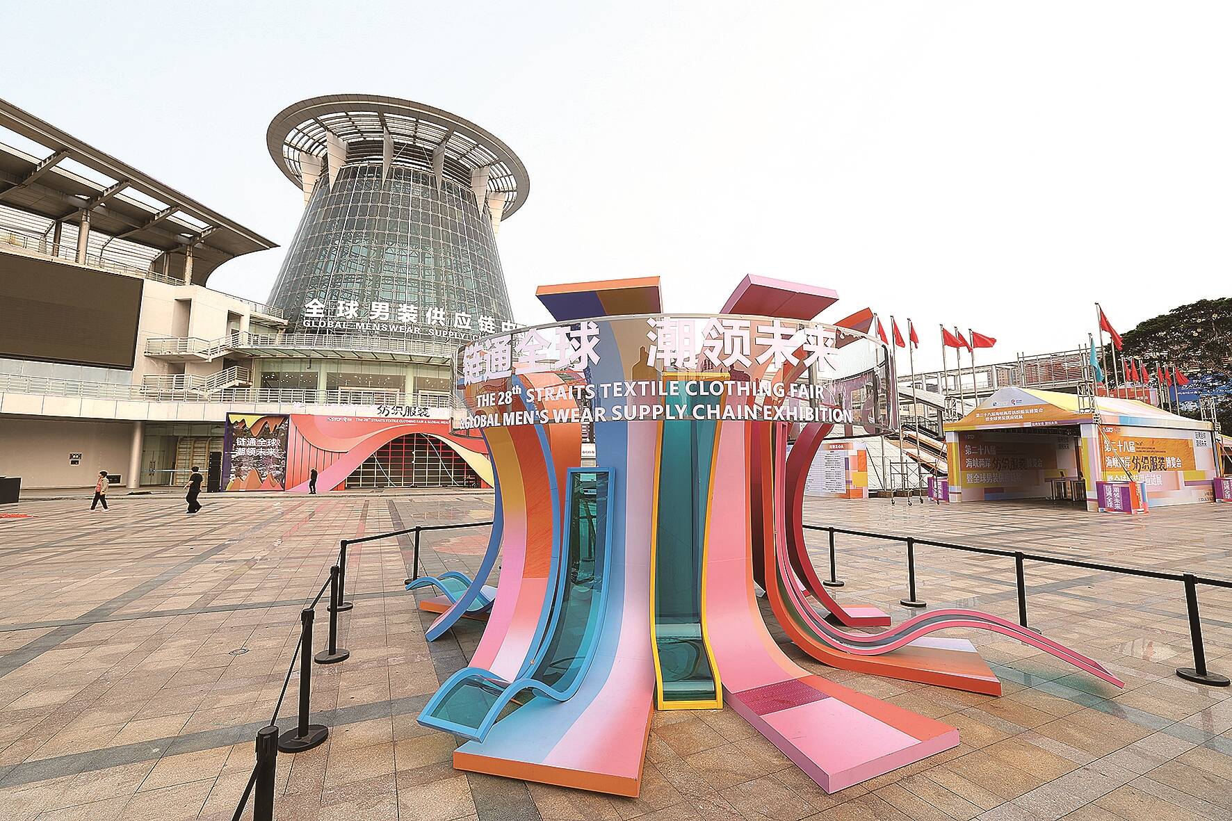 色彩明快的波浪造型入口、以纺织线条为灵感的艺术装置错落排布,场馆内外装饰一新,处处洋溢着时尚活力与开放包容的浓厚氛围……4月17日下午,记者前往第二十八届海峡两岸纺织服装博览会暨全球男装供应链展活动现场,实地探访展会各项筹备工作进展。