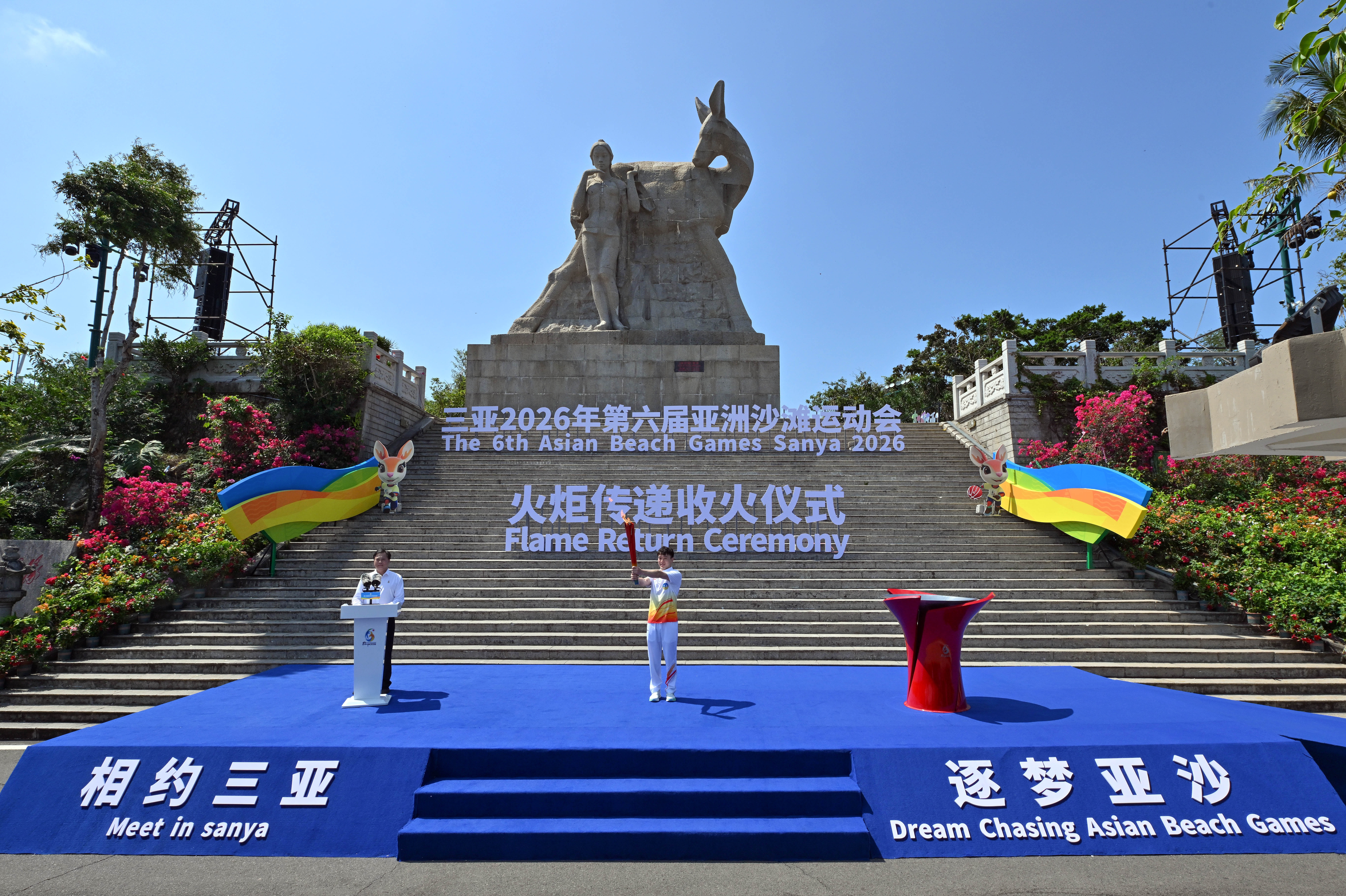 3月30日,最后一棒火炬手齐广璞手持火炬抵达收火仪式现场。3月30日,第六届亚洲沙滩运动会火炬传递活动在海南三亚举行。74名火炬手接力奔跑,串联起约10.5公里的三亚湾沿线景观。第六届亚洲沙滩运动会将于4月22日至30日在海南三亚举行,共设14个大项、15个分项、62个小项,将产生62枚金牌。(新华)