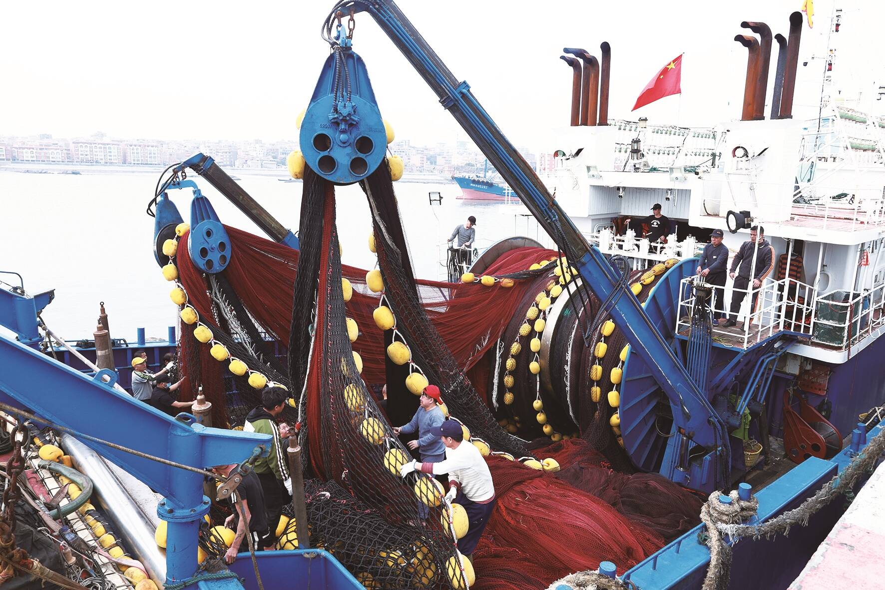 临近中午时分,记者在码头看到,一辆大型吊车在司机的熟练操作下,将渔网从岸上缓缓吊运到一艘渔船上。船甲板上,工人们分工明确,各司其职,有的操作船上的吊机,协助将渔网等捕捞设备安置到位;有的则忙着舒展渔网,确保在使用时能够充分展开;还有的在整理船舱,为即将开始的海上作业做好充分的准备。据船主介绍,春节前渔船归港后便进入了休整期。随着春节假期的结束,船员们陆续归来。大家一边忙着对船体开展保养维护,一边等待合适的天气条件出海。“今天天气晴好,海风适宜,正是出海良机。”据介绍,一切准备就绪后,他们的渔船当天就将出发。