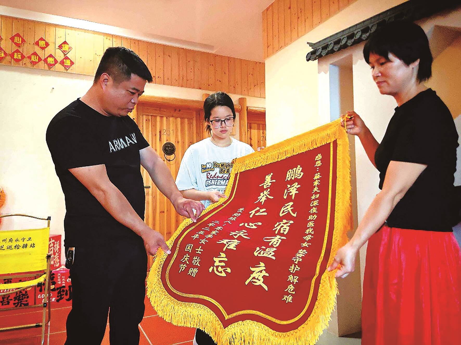 这面锦旗的背后,是一个暖心救助故事。10月5日中午,从广东梅州到石狮旅游的李女士和女儿入住“鹏泽海品民宿”。当晚10时46分,蔡鹏泽的妻子刘美娜突然接到李女士求助电话。原来,李女士突发不适,浑身发冷并伴有四肢酸痛,其女儿也出现呕吐症状。李女士下楼求助,身体已近乎瘫软。