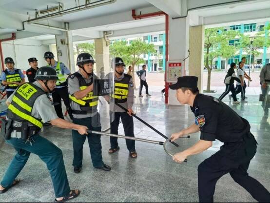 为进一步检验培训效果,现场还模拟“暴徒企图强行闯入校园”的突发事件场景。校园安保团队立即启动应急预案,按照培训要领,迅速组成防暴队形,利用盾牌和钢叉进行阻拦、周旋与合力制服。整个演练过程紧张有序,各环节响应迅速、配合默契,达到了预期效果。