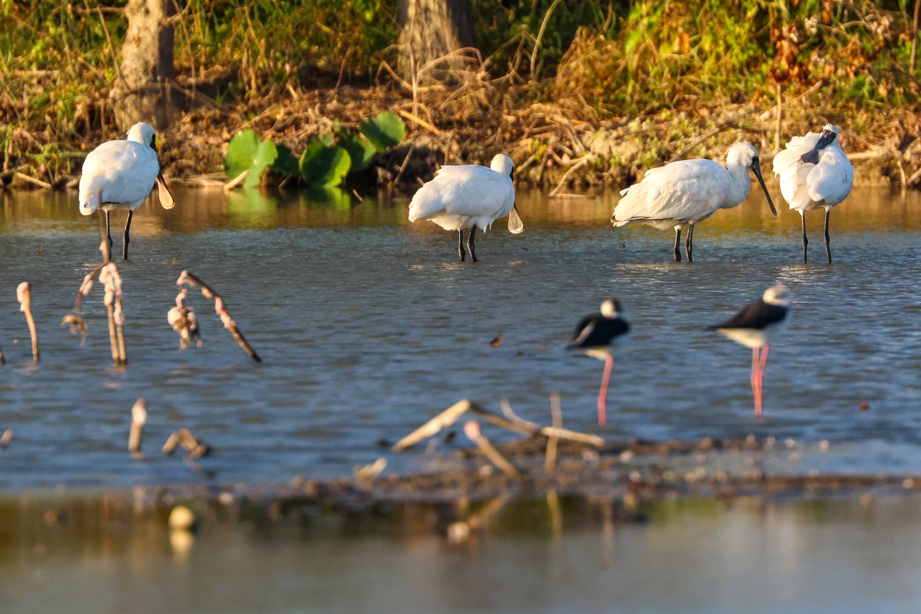 琵琶嘴、黑脸庞、白衣裳……黑脸琵鹭因其鸟喙与中国乐器琵琶极为相似而得名,亦因其姿态优雅,又被称为“黑面天使”或“黑面舞者”。在石狮湿地公园,黑脸琵鹭用其扁平如汤匙状的长嘴,扎在藕塘里像扫雷一样来回晃动觅食;黑脸琵鹭与白琵鹭极为相似,但黑脸琵鹭的额、喉、脸、眼周全为黑色。黑脸琵鹭数量稀少,根据香港观鸟会发布的2025年全球黑脸琵鹭同步普查结果显示,其全球数量为7081只。