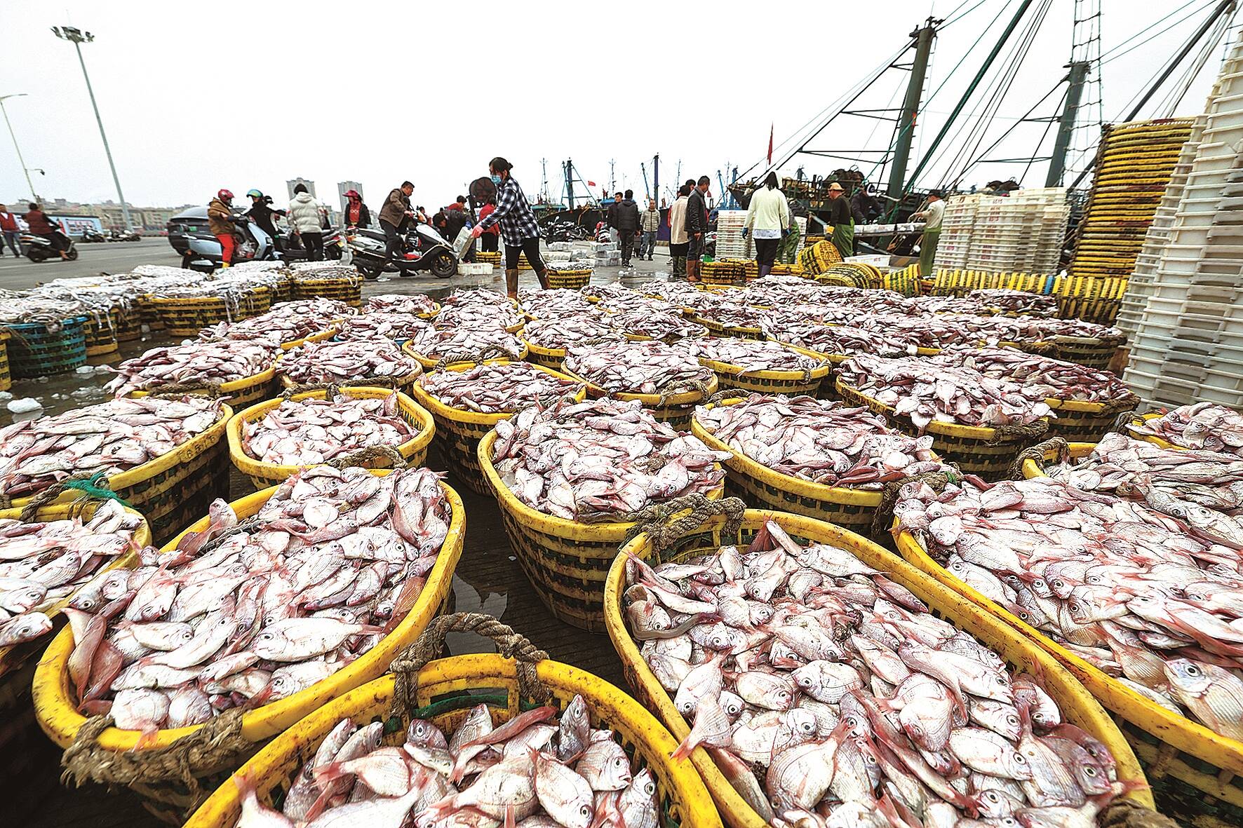 新春伊始,石狮祥芝国家中心渔港内一艘艘渔船陆续靠岸,卸下满舱渔获。2月26日,记者在渔港码头看到,一筐筐刚从海上捕捞上来的渔获整齐码放,泛着新鲜的光泽。渔民们在渔获间来回穿梭,有的忙着搬运、分拣,还有的忙着将渔获装车运往市场销售。