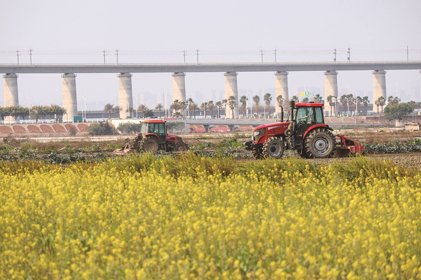 3月22日,在湿地公园的田地里,红色拖拉机往来穿梭,翻耕土地,为新一季的播种做足准备。远处,福厦高铁的列车如银龙般掠过高架桥梁,在金色花海的映衬下,市民骑行漫步,在花海与绿意间定格春光,尽享生态湿地的惬意。
