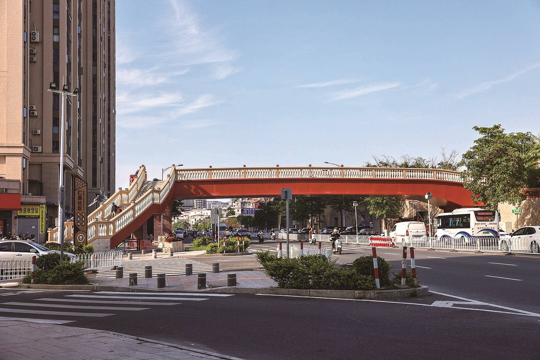 当日下午,记者第一时间定格下天桥的新貌。无论是桥身还是两侧梯道的墩柱,都喷涂或铺贴上“闽南红”色调的外立面,更好地融入老街古厝的整体风格。同时,护栏扶手上还装饰兼具照明功能的古厝造型景观小品,让整座天桥成为该区域的一抹亮丽风景。
