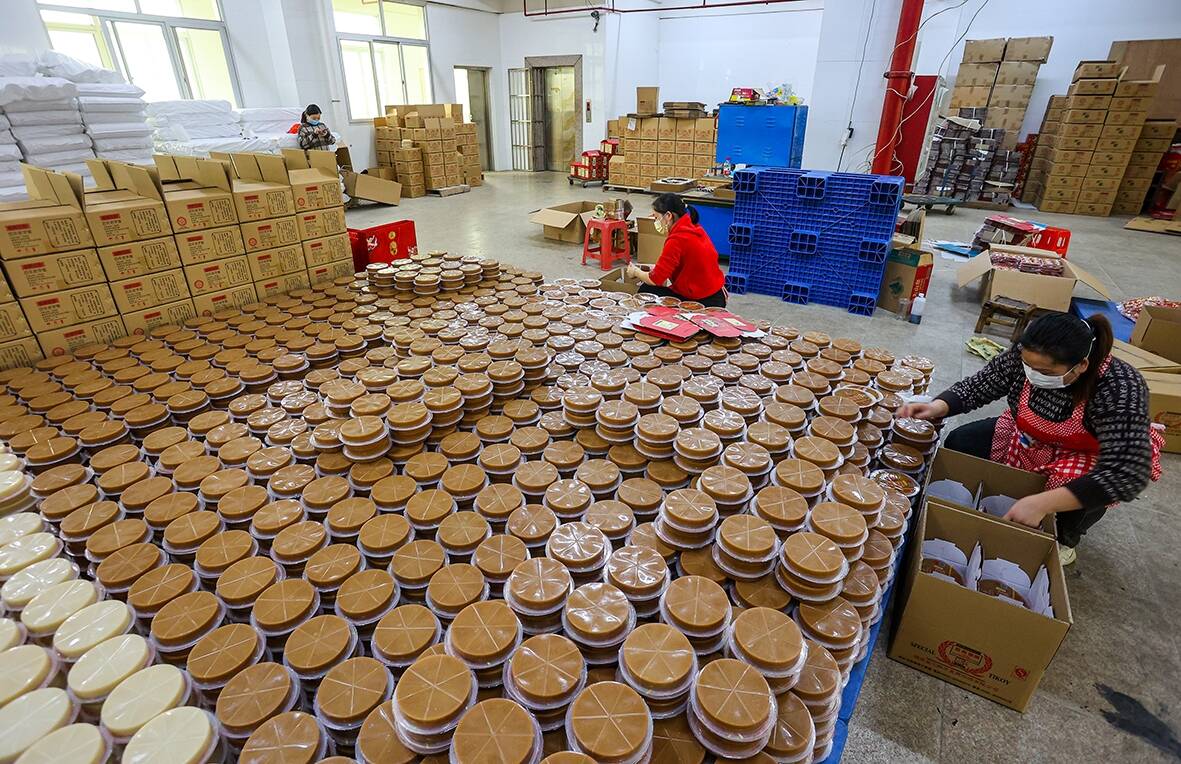 临近中午,记者来到塘头村义兴甜粿食品公司。一会儿工夫,就有多部面包车、私家车先后开到厂门口提货。义兴甜粿第四代传承人王金田忙得团团转,而他的手机也不时响起。每年这个时候,老王与家人都特别忙,甜粿的销量比往常多很多。
