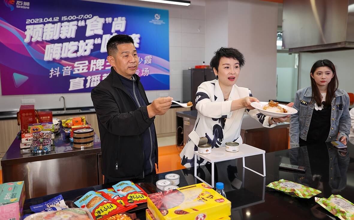 4月12日下午,抖音金牌主播少霞在中国石狮国际食品城中央厨房开展直播带货专场活动。直播中,各种一元秒杀、直播福利纷纷登场,吸引大家下单抢购各种预制美食,掀起阵阵带货高潮。