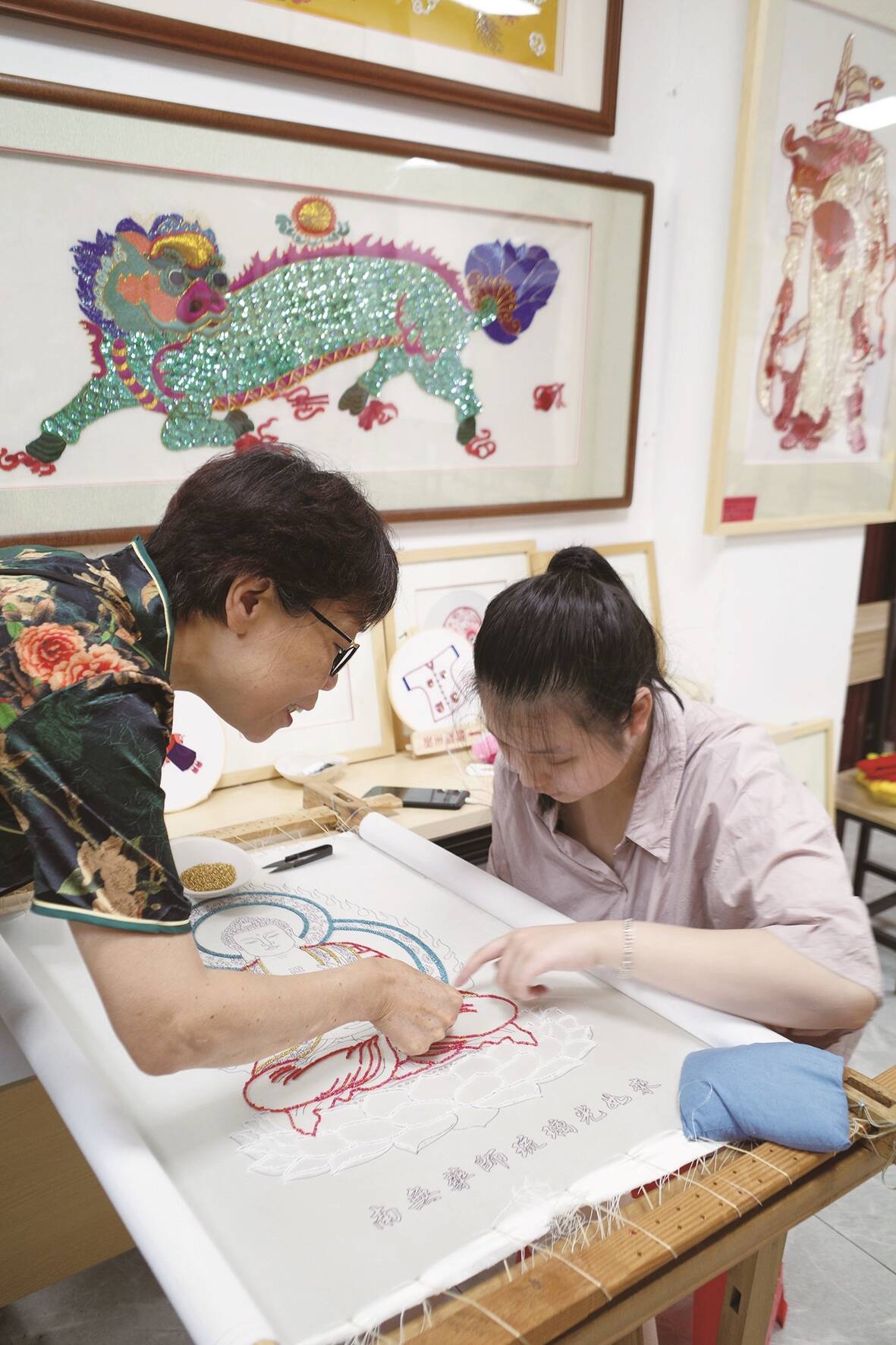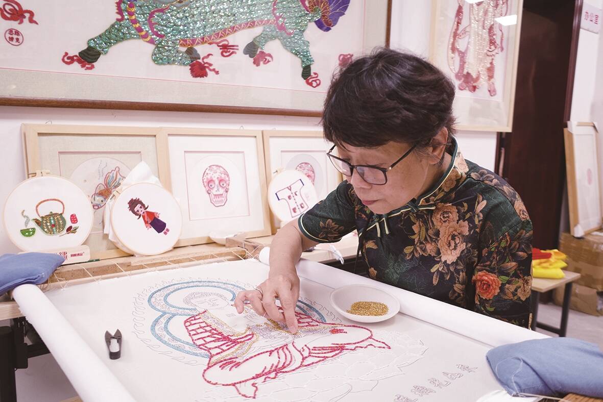 在陈克忍的工作室里,笔者注意到有不少珠绣作品,每一幅作品都栩栩如生、珠光宝气,与传统金苍绣不一样,这些绣品用珠子和亮片绣成。陈克忍介绍说,珠绣是在金苍绣的基础上发展而来的。其祖母娘家是大户人家,从小就享用来自菲律宾的各种“舶来品”,其中一种用珠子装饰的女士拖鞋是祖母的最爱,可裹脚的她并不能穿,于是她将拖鞋剪破取下珠子,将珠子绣在自己的小鞋和裤子上,这给陈克忍很大的启发,能否将珠子和刺绣相结合呢?从此,陈克忍绣作上开始出现大量的珠子亮片,由此成就了独特的珠绣技艺。用珠绣制作的绣品更具层次感,英国、美国、马来西亚等国不少人慕名购买收藏陈克忍的珠绣作品。