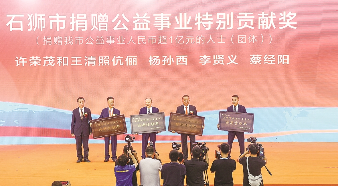 石狮表彰 捐赠公益事业贡献人士(团体) 10月30日,在2023年世界石狮同乡恳亲大会暨第三届石狮市海外联谊会、第五届世界石狮同乡联谊会、第一届世界石狮青年联谊会理监事就职典礼上,石狮市委市政府发文表扬石狮市捐赠公益事业贡献人士(团体),颁授“石狮市捐赠公益事业特别贡献奖”“石狮市捐赠公益事业突出贡献奖”“石狮市捐赠公益事业贡献奖”奖匾和荣誉证书。