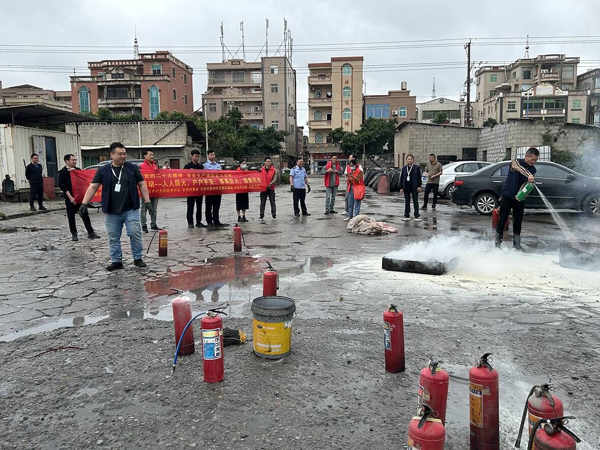 5月13日,石农村党委联合石狮市城市管理局、蚶江派出所、石农村新时代文明实践站、石农村妇联在港鑫汽修厂举办消防演练活动,通过消防安全应急演练增强辖区群众的消防意识,提高群众消防应急能力和自救能力。石农村“两委”、网格员及党员代表、村民代表、企业从业人员30余人参加。