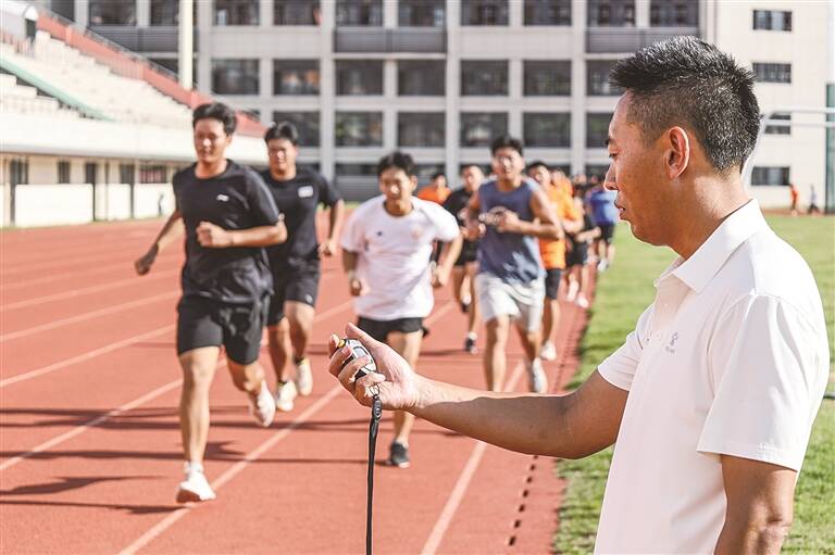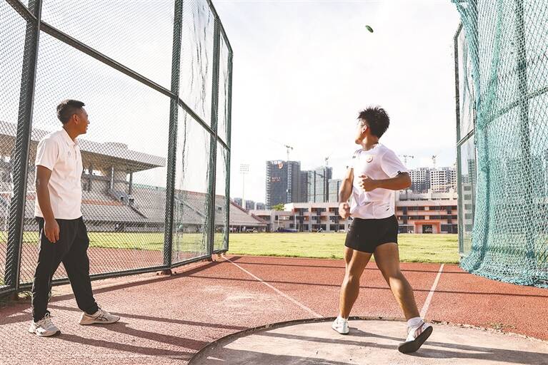 “摆臂、闷住、小步伐要有节奏,一二三甩……非常棒!”王伟说话时嗓音沙哑。下午4时许,王伟对运动员们进行铁饼项目的指导,从每天前一晚的训练计划到隔天的训练内容都很丰富。“孩子们其实也很辛苦,每天凌晨5时30分便要起床训练,从基础的热身到技术模仿等方面。”殊不知在运动员们起床前,凌晨5时王伟便已整装完毕前往运动场以及各类器材室进行检查,为运动员们的安全训练提前做好保障。