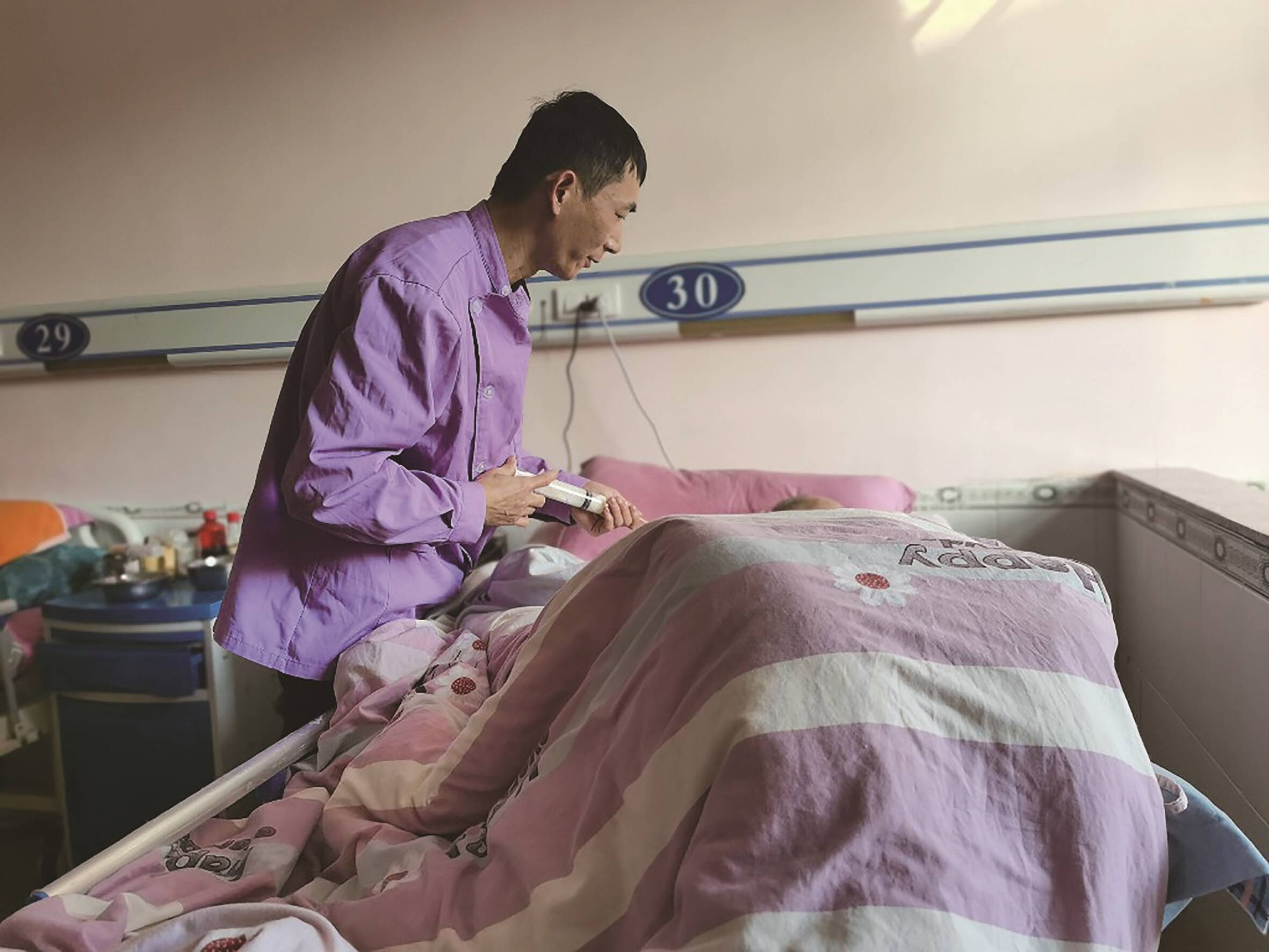 12月3日下午4时许,1977年出生的吴晓瑜正在细心地为老人翻身、拍背,给老人喂食下午点心。一年前,持有养老护理员证的吴晓瑜来到温晴养老服务有限公司振狮分院,成为该分院里的一名男性养老护理员。作为院里唯一的一名男性养老护理员,吴晓瑜虽然像“绿叶”,但在岗位上“须眉不让巾帼”,撑起了养老护理工作半边天。