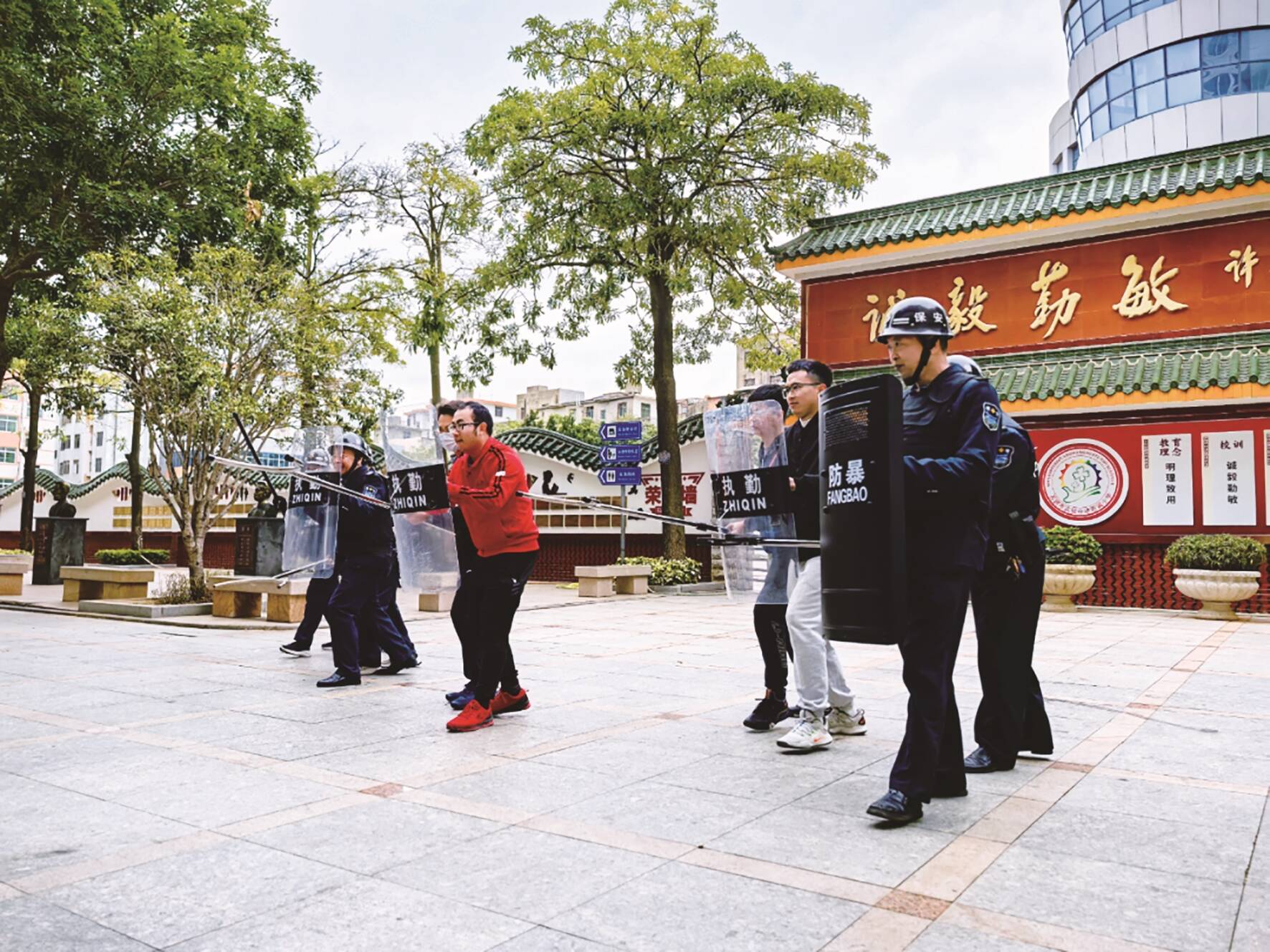 演练开始前,学校法治副校长蔡火金警官对参与演练的保安员以及男教师们进行了简要的器械培训,确保他们在面对暴恐分子时能够迅速、准确地做出反应。