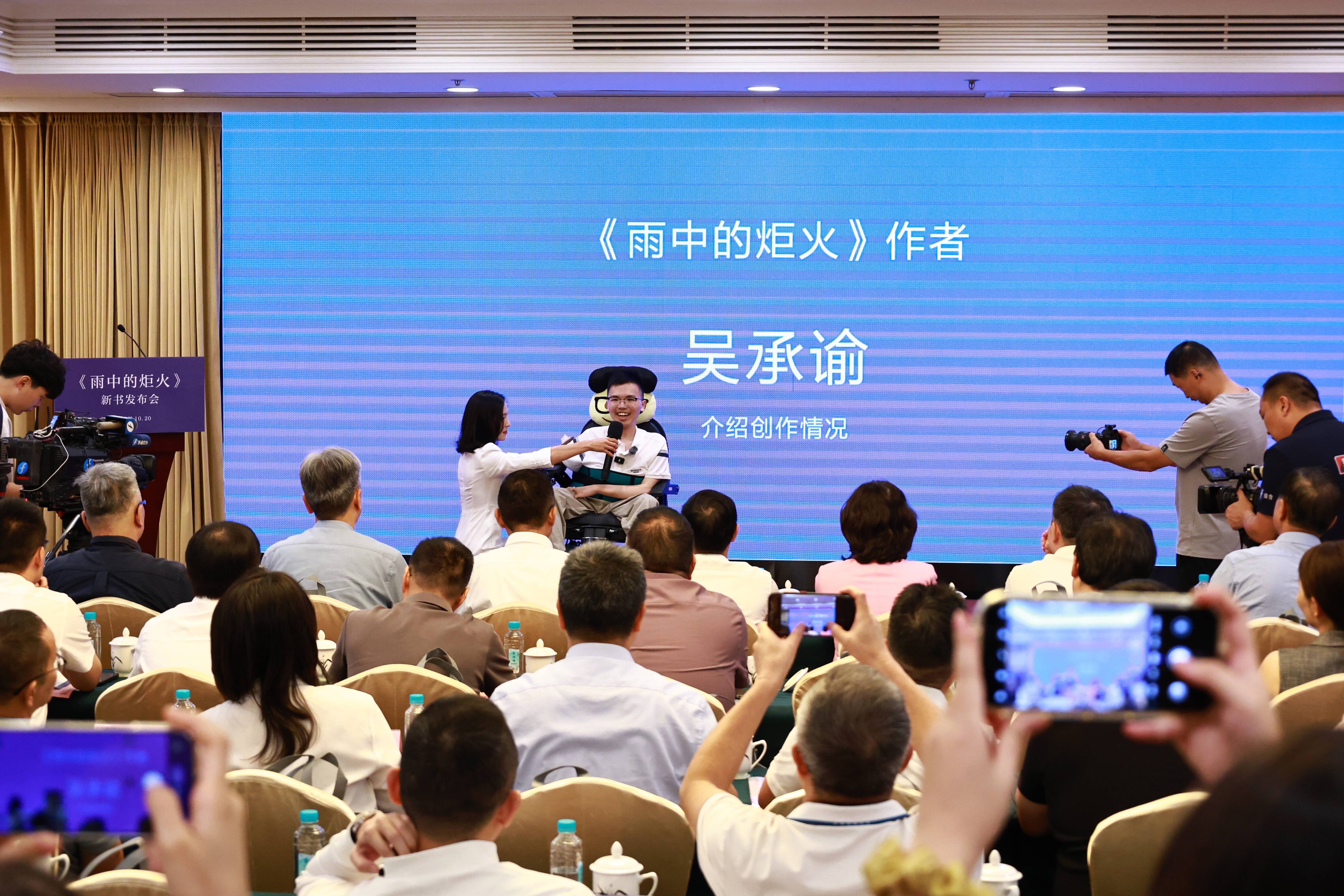 进入大学后,吴承谕有了更多时间阅读、思考,思想更加深刻,对残病、苦痛等生命本质的问题有了更为成熟的看法。身体愈是无力,他愈是不敢懈怠,通过写作创造人生价值的愿望更加炽烈。用纸笔写字费力、太慢,他就改用手机写作,用手指在手机屏幕上划出汉字,《雨中的炬火》一书就是他在大学一二年级期间,用手指一笔一笔划出来的。这本书被确定为2025年福建省重点出版立项项目、2025年福建省优秀出版项目。