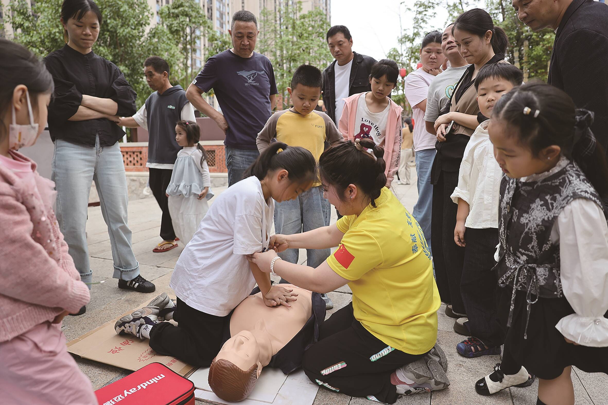 与之相邻的急救教学区同样吸引市民的积极参与,石狮市120急救志愿者服务队把急救课堂搬到活动现场,为市民系统传授心肺复苏、AED操作等关键急救技能。“双手掌心向下交叠,放在两乳头连线中点,按压胸骨中下段,按压深度5至6厘米,每分钟100至120次,每按压30次配合2次人工呼吸……”志愿者在模拟人身上进行标准示范,市民们围站成圈,眼神专注,紧盯细节,并纷纷上前练习。从心肺复苏的正确手势、按压部位、频率与深度,到AED设备的开机流程、电极片粘贴,志愿者逐一拆解,仔细纠正,让大家听得懂、学得会、用得对,真正掌握自救与互救的本领。