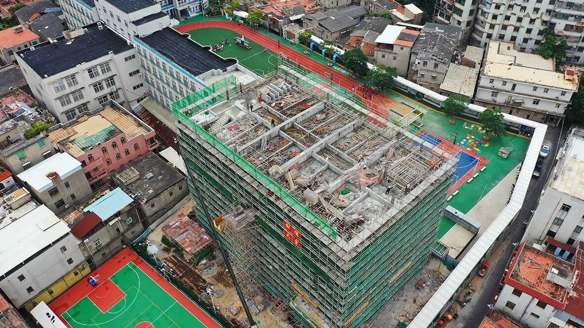 近日,随着6层顶板最后一方水泥混凝土浇筑到位,新湖中心小学扩建项目正式封顶!