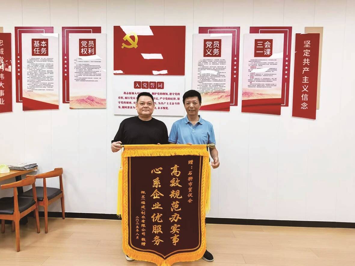 2025年8月21日,佩兰(福建)制衣有限公司总经理王文君专程来到市贸促会,将一面写有“高效规范办实事 心系企业优服务”字样的锦旗送到会长苏斌手中,感谢该会积极协助企业通过泉州市贸促会办理自由销售证书,及时解决了产品出口难题。