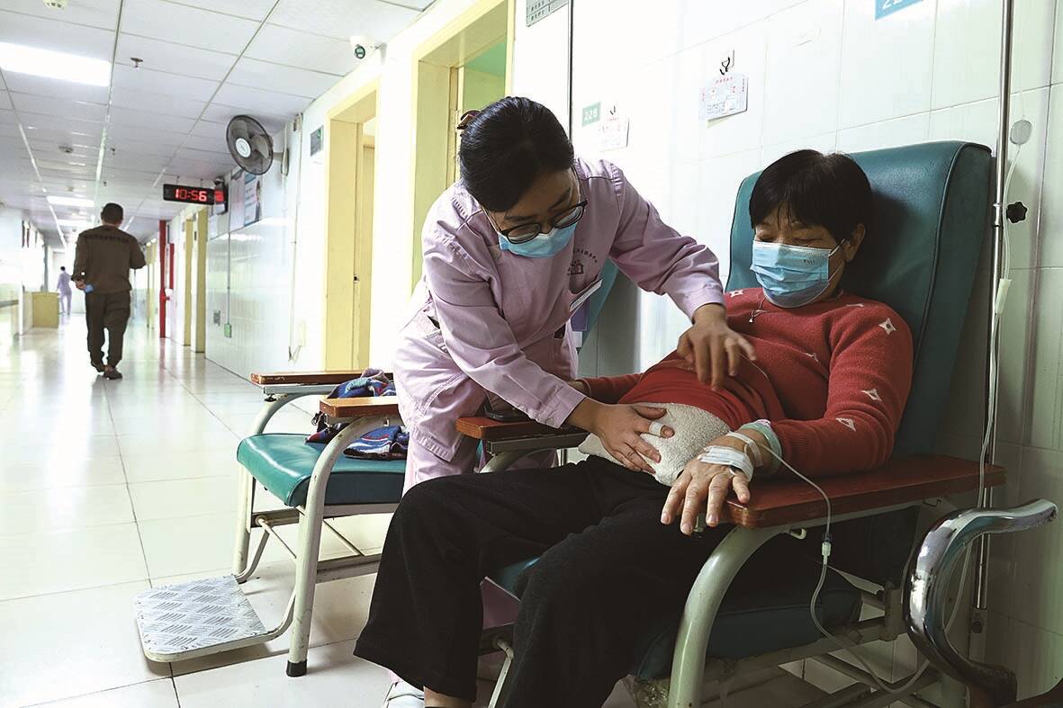 “阿婆,输液时我们顺便给您贴上这个中药热奄包,对缓解便秘有帮助。”如今,中西医结合的治疗场景在全科医疗科已十分常见。
