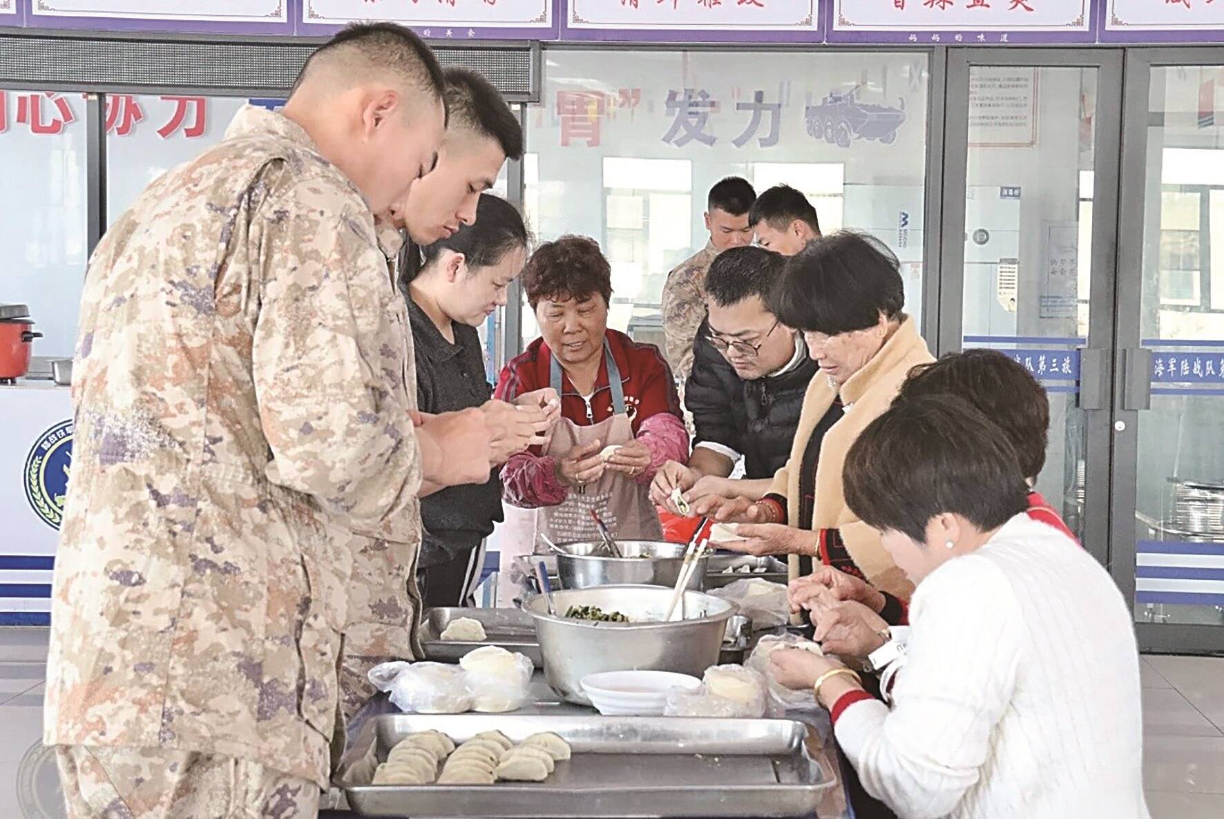 12月21日,驻石部队某营区食堂暖意融融,许珊雅(图中左三)带领拥军大妈缝补队的成员,带着面粉和馅料与官兵们围坐共包冬至饺子,欢声笑语中满是家的温馨。大家边切磋包饺技巧,边拉家常话冷暖,热气腾腾的饺子出锅时,香气氤氲了整个营区。“虽然不能回家,但和大妈们过节就像和家人团圆了一样。”一名官兵的感言道出了全体官兵的心声。