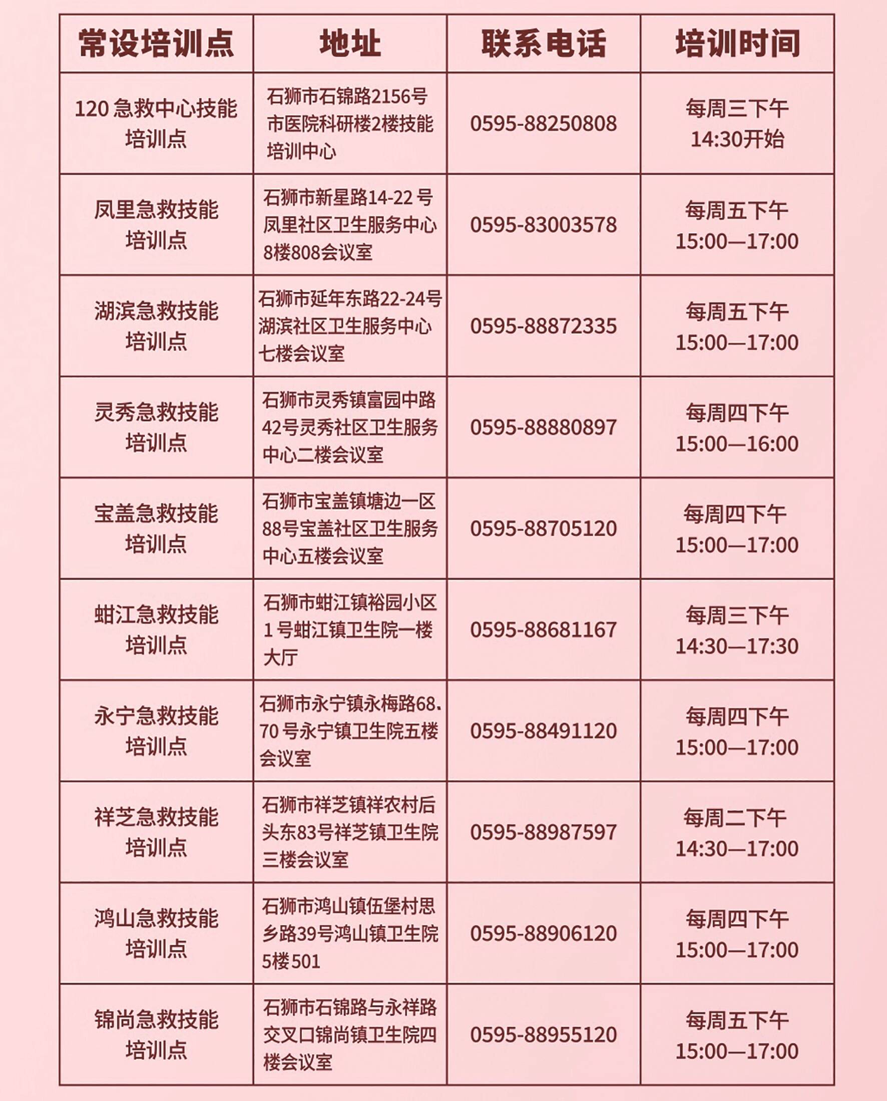 “常设点”培训则面向普通市民,在每周固定时间开展。目前,市医院及9个基层医疗卫生机构已设立培训点,全年常态化开放,市民可根据各点开放时间前往学习。