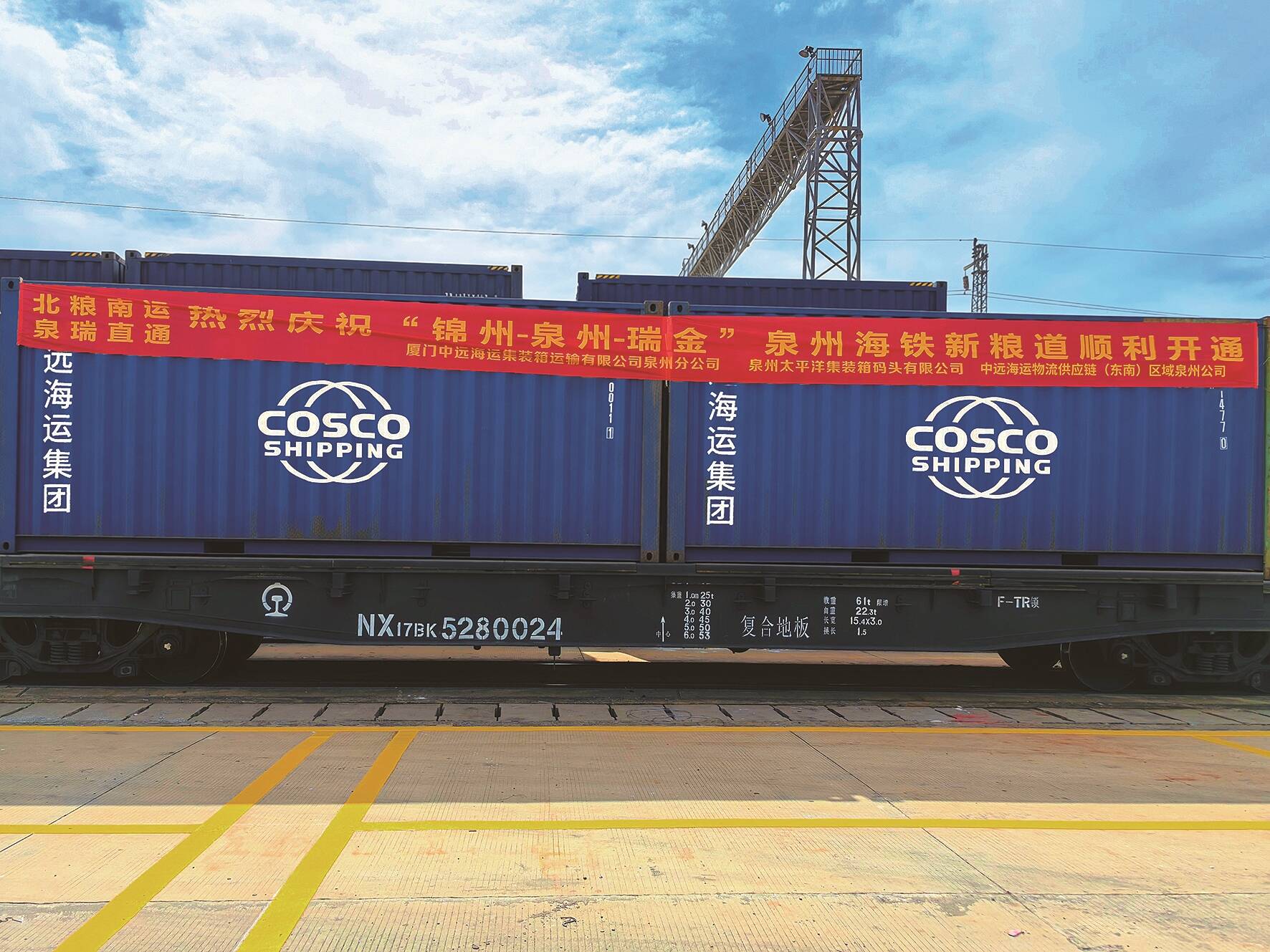 12月初,泉州太平洋集装箱码头携手上海泛亚、厦门中远海运集装箱运输有限公司泉州分公司、中远海运物流供应链(东南)区域公司泉州分公司、黄塘铁路站等战略合作伙伴,在石湖港正式开通“锦州—泉州—瑞金”北粮南运海铁联运新通道,并圆满完成首航任务。 |
