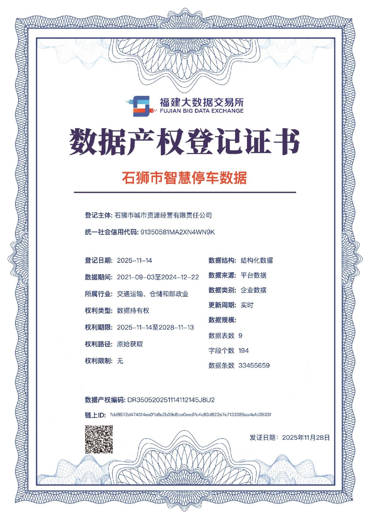 11月17日,工业和信息化部信息中心公布2025年产业园区推进新型工业化典型案例名单,石狮高新区从全国众多工业产业园区中脱颖而出,成功入选2025年产业园区推进新型工业化典型案例(产业集聚类)。 据介绍,石狮高新区立足自身,聚焦光电信息智能制造产业集群发展,实现产业的集聚与升级。 9 获颁全省首批智慧停车数据产权登记证书