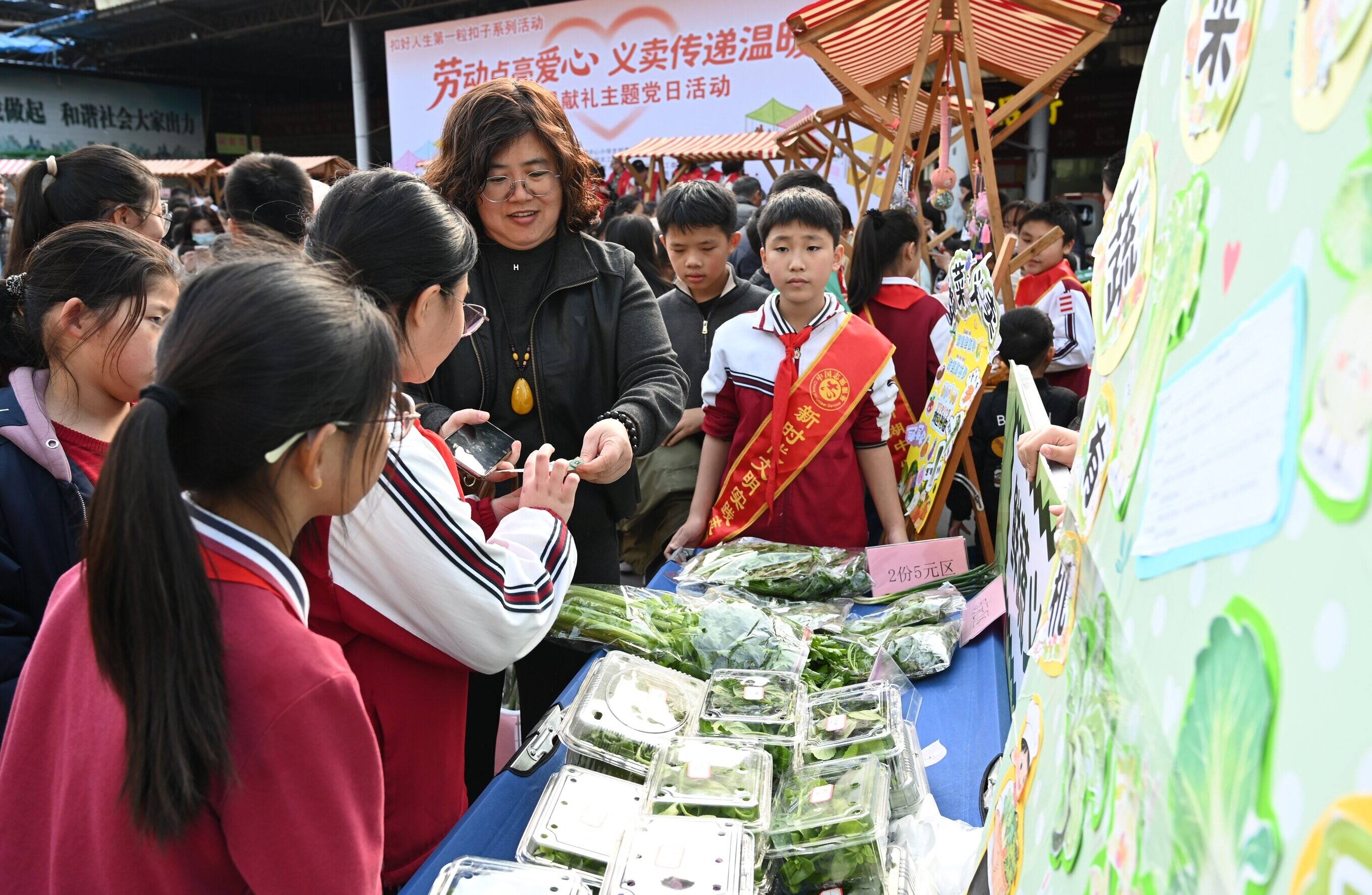 活动现场,“珠光宝气”“包你满意”“丝带传情”“中药与养生”等10个义卖摊位整齐排开。义卖品涵盖手工制品、特色食品、养生小物等。队员们化身“小摊主”,热情地向来往的师生与居民推介自己的作品。现场叫卖声、欢笑声此起彼伏,充满节日般的热闹氛围。