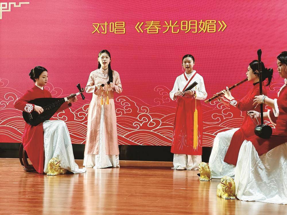 展演环节,包括《霏霏飒飒》《直入花园》等7个经典南音曲目轮番上演,涵盖演奏、表演唱、大合唱、对唱等多种形式,部分老学员还专程赶回参与演出,美妙的唱腔与娴熟的演奏赢得现场阵阵掌声。