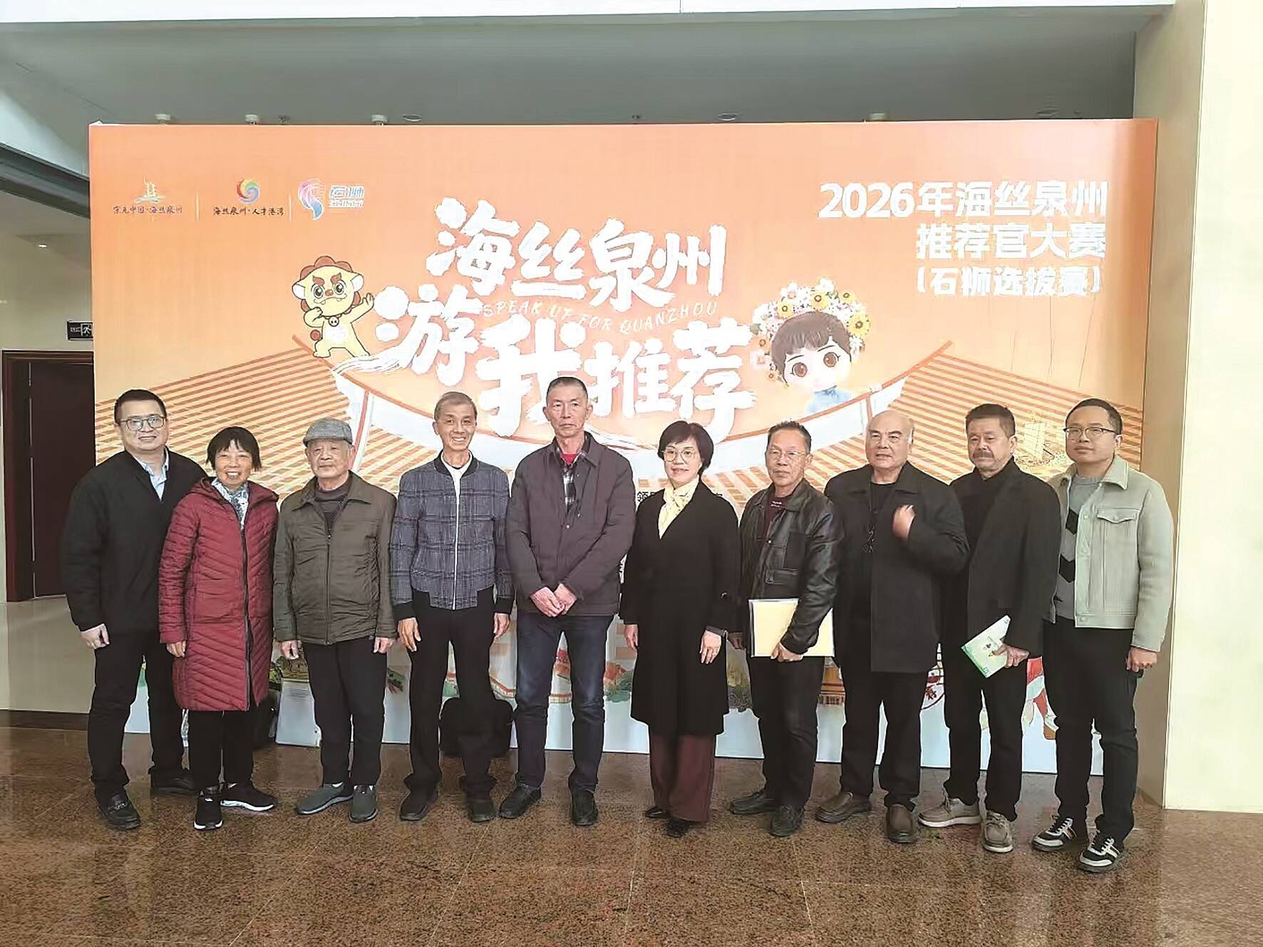 “退休不是人生的终点,能以推荐官的身份为海丝文化代言,是我们晚年生活中最有意义的事。”老同志们纷纷感慨。在他们看来,海丝文化是石狮弥足珍贵的文化财富,作为海丝文化的亲历者与见证者,他们有责任、更有义务把这些动人故事讲给更多人听。石狮市委老干部局相关负责人表示,此次组织银发人才参赛,既为老同志们搭建了发挥余热、实现价值的广阔平台,也让海丝文化在代际传承中焕发新生机。选拔赛即将进行,该局表示,将持续为银发战队提供全方位支持,助力他们在大赛中充分展现石狮银发风采,让千年海丝文脉在“银发力量”的守护与传承中生生不息。图为参加“海丝泉州推荐官”活动的部分参赛选手和市委老干部局工作人员合影(记者 刘晓娟)