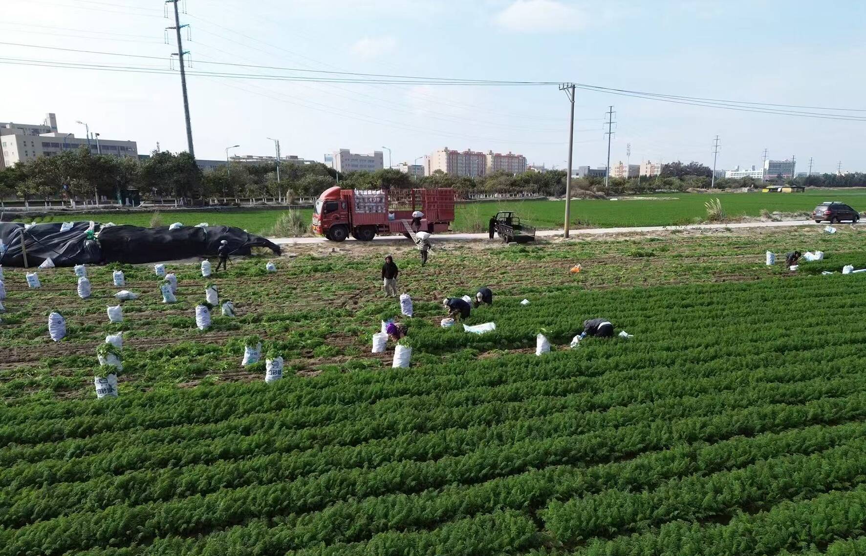 在祥芝镇莲坂村高标准农田内,翠绿的胡萝卜缨子迎风轻摆,泥土之下,新鲜胡萝卜静待采收。种植户陈淑梅正带领工人有条不紊地开展作业,去缨、分拣、装袋一气呵成,动作娴熟麻利。