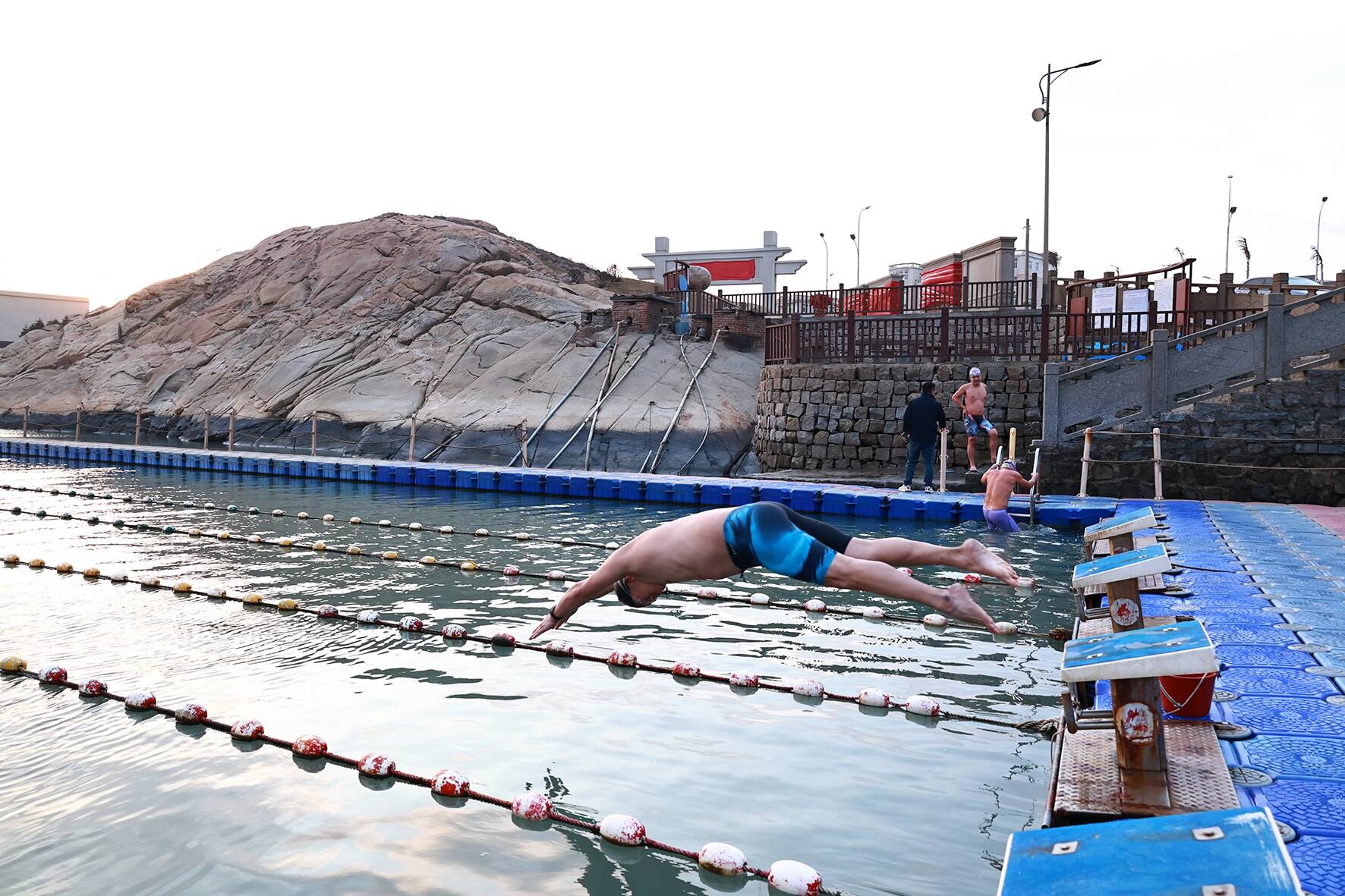 1月23日16时许,夕阳西斜,我市实时气温降至13℃。在东埔海岸边一处游泳基地,海风凛冽,却挡不住一群冬泳爱好者的热情。他们身着泳装,纵身跃入海水泳池,开启每日例行超千米的户外冬泳健身活动。