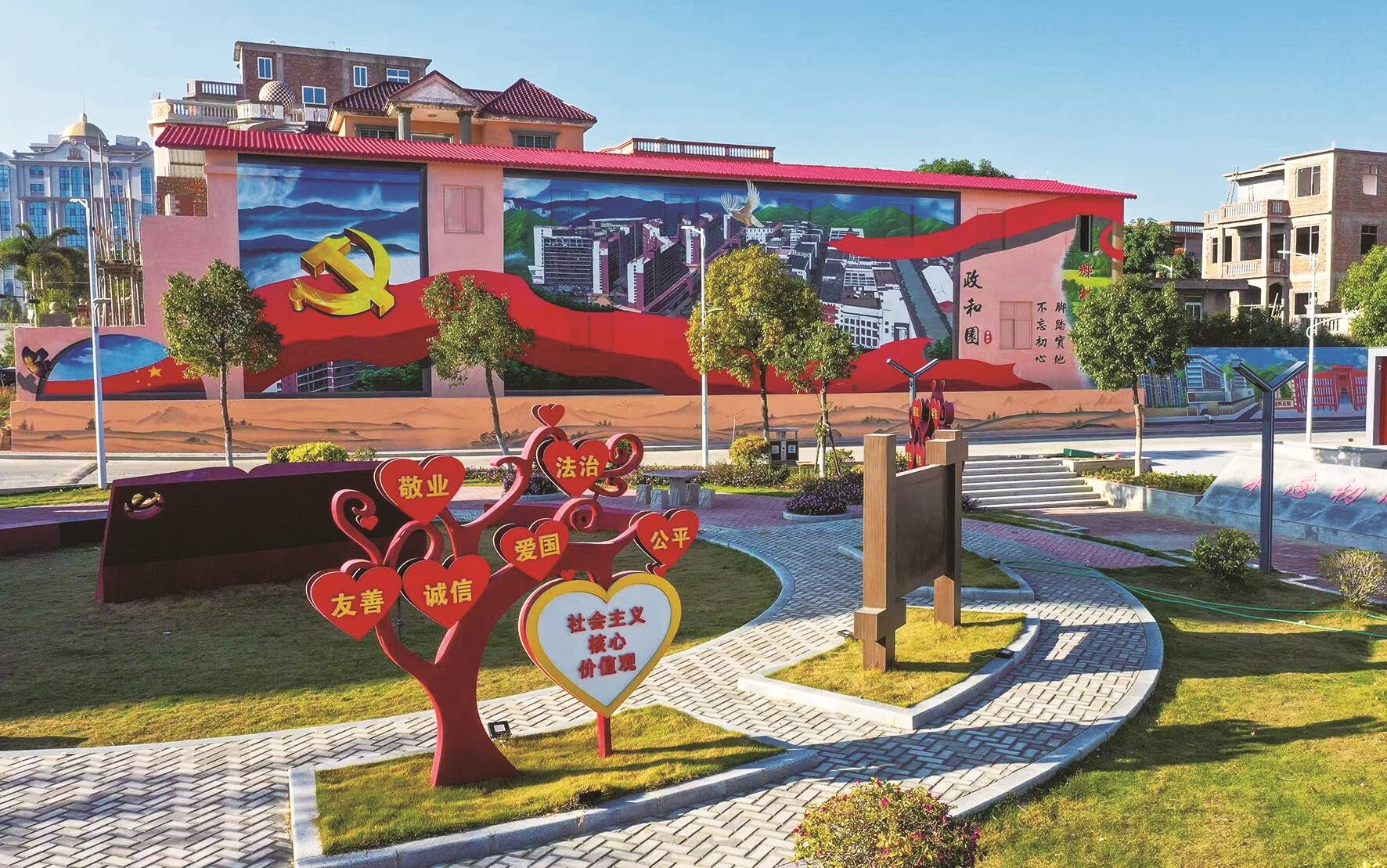 从海岸走进锦尚镇港前村,一幅生态宜居的乡村新画卷徐徐展开。占地面积近百亩的港前村“党建+”邻里中心广场,右前方是红灰配色的文化长廊,左前侧是色彩十分鲜亮的下沉式灯光球场,左后方的“全民健身”广场上,各类健身器材整齐排列,正前方的主题公园里,步道、草坪、休闲座椅等元素布局合理,连广场路边的墙面上,也绘有欣欣向荣的“政和园”工业园壁画,为村庄增添了一抹艺术气息。