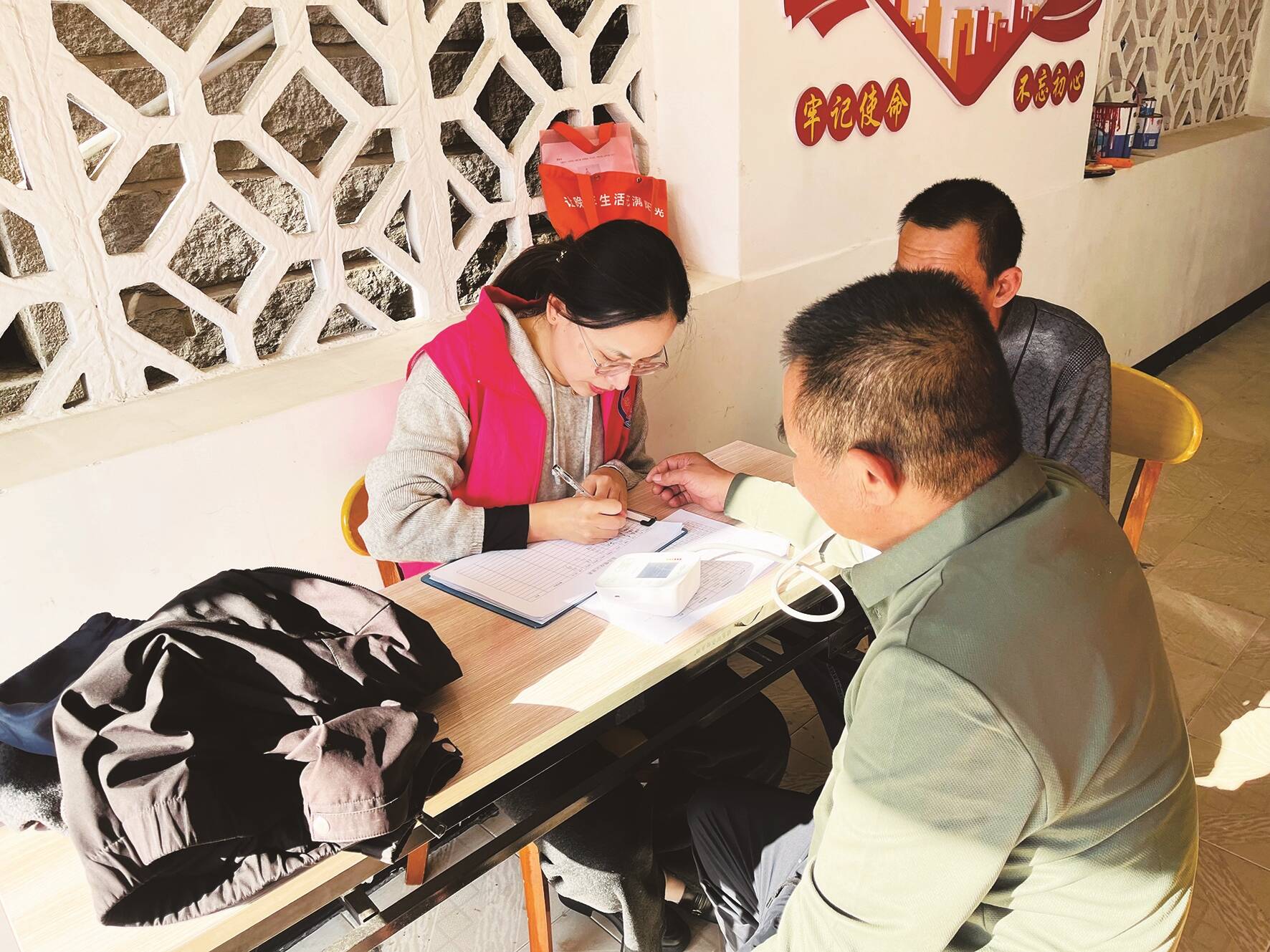 社工为老人量血压