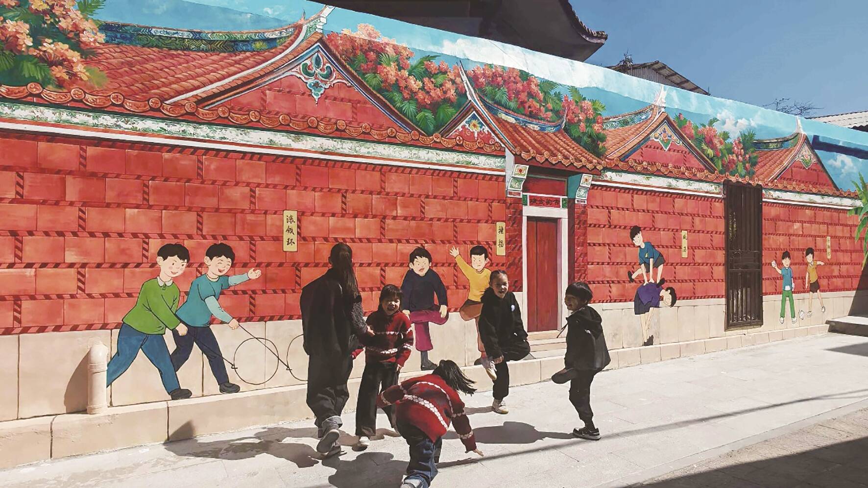 在番仔楼旁的街巷,一面以闽南童趣为主题的墙绘格外吸睛。墙绘以红砖古厝为背景,生动再现了滚铁环、跳马、拍画片等经典童年游戏,孩子们的笑脸与古厝的燕尾脊相映成趣。在此玩耍的孩子会模仿画中的动作,在墙前奔跑嬉戏,让静态的壁画瞬间“活”了起来,也唤醒了几代人的共同记忆。