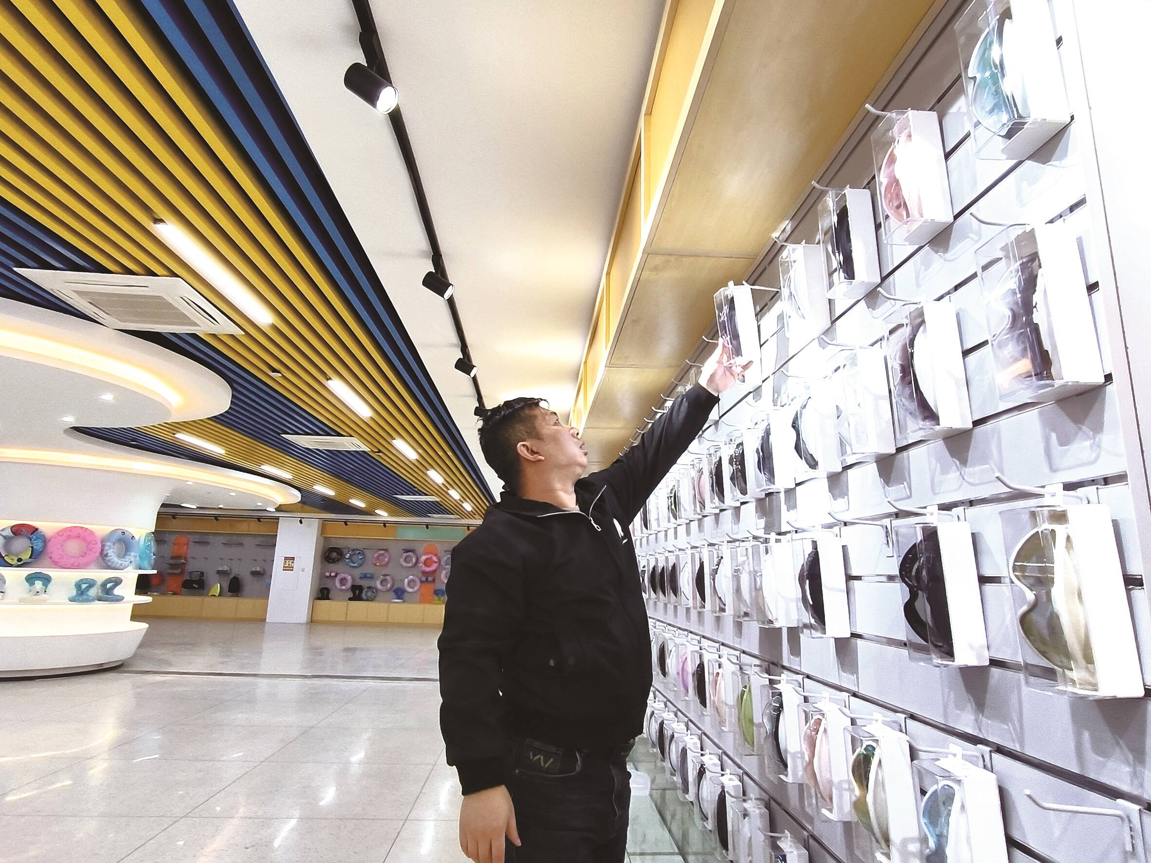 “新年新气象,公司各方面走上正轨后,我们准备大干一场,开发出更多技术先进、消费者喜爱的泳镜、泳圈、泳衣新产品,推动公司高质量发展。”颜建光对公司未来发展充满信心。图为福建省胜佰龙体育用品科技有限公司员工在展示产品 (记者 尼松义)