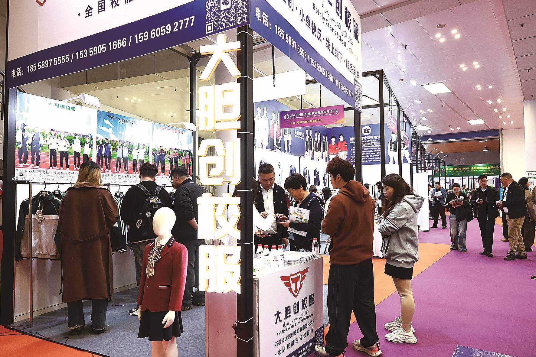 ▲3月20日,在第六届校博会现场,客商参观校服产品