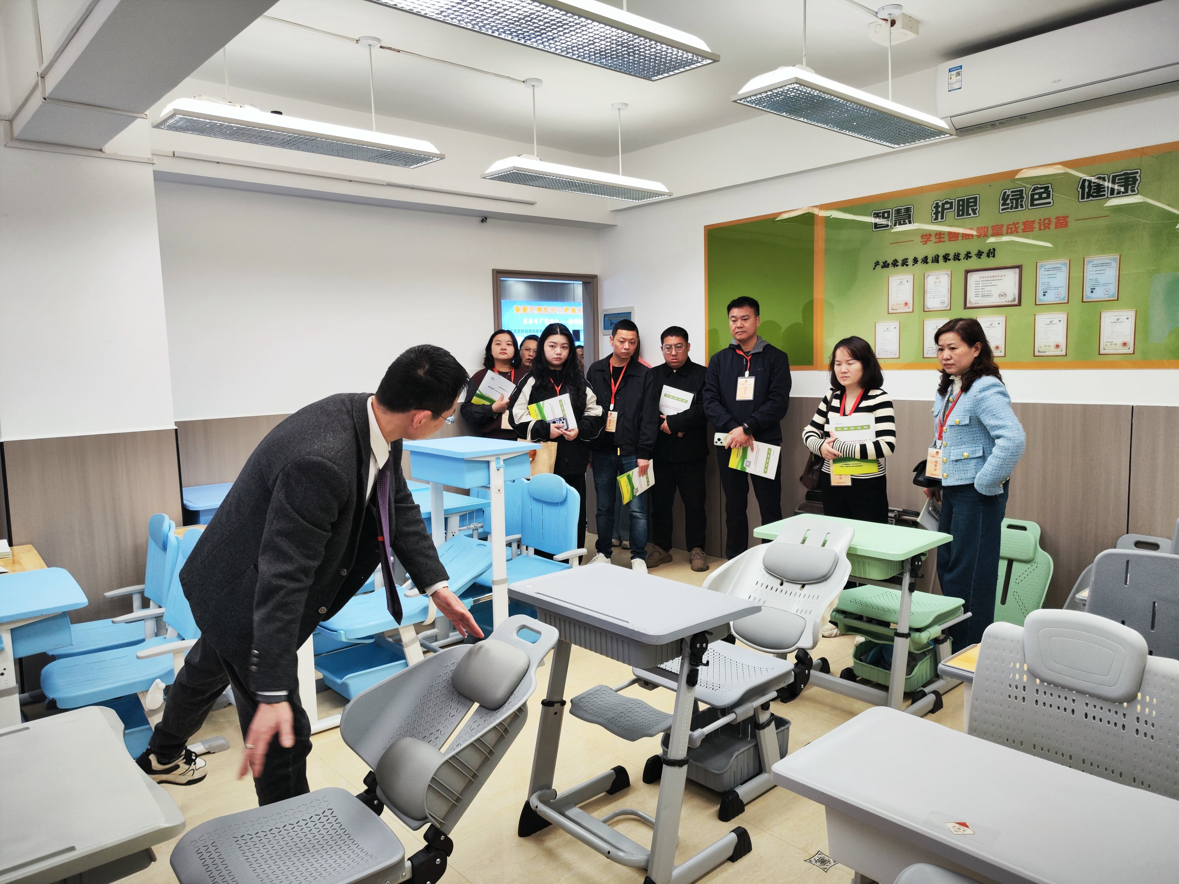 据悉,福建智绿康科技发展有限公司创办于2013年,如今手握40多项国家技术专利及多项国家技术发明奖,连续6年获评“科技型中小企业”,累计斩获20余项省级以上资质认证,其产品通过福建省权威机构联合检验认证,彰显硬核技术实力。公司主打智能防近视课桌椅、护眼灯、智慧互动讲台等产品。