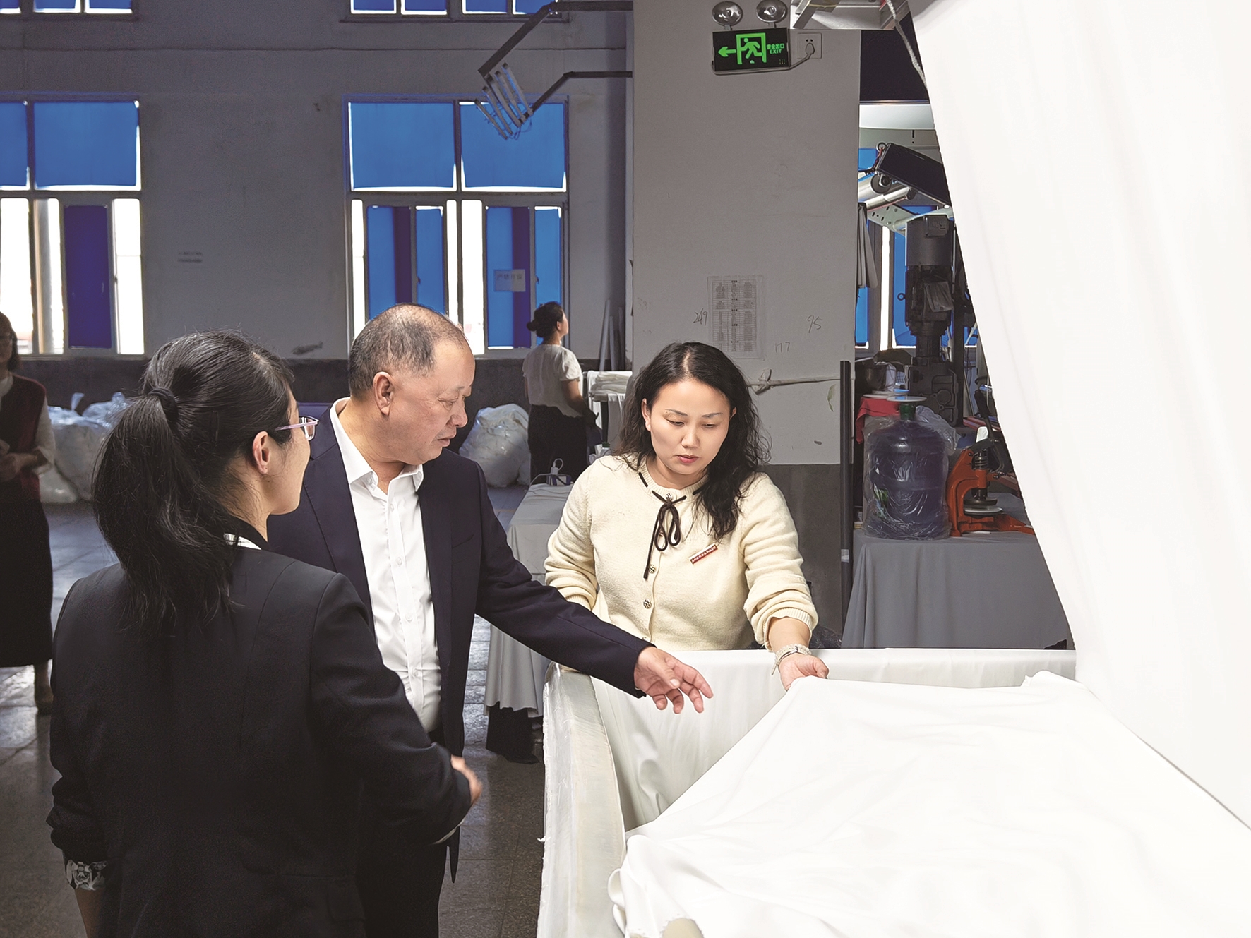 在凌峰漂染织造有限公司,黄跃鹏一行重点考察公司特色面料的后整理生产线。企业负责人详细介绍公司在功能性面料研发、市场快速响应等方面的独特优势。