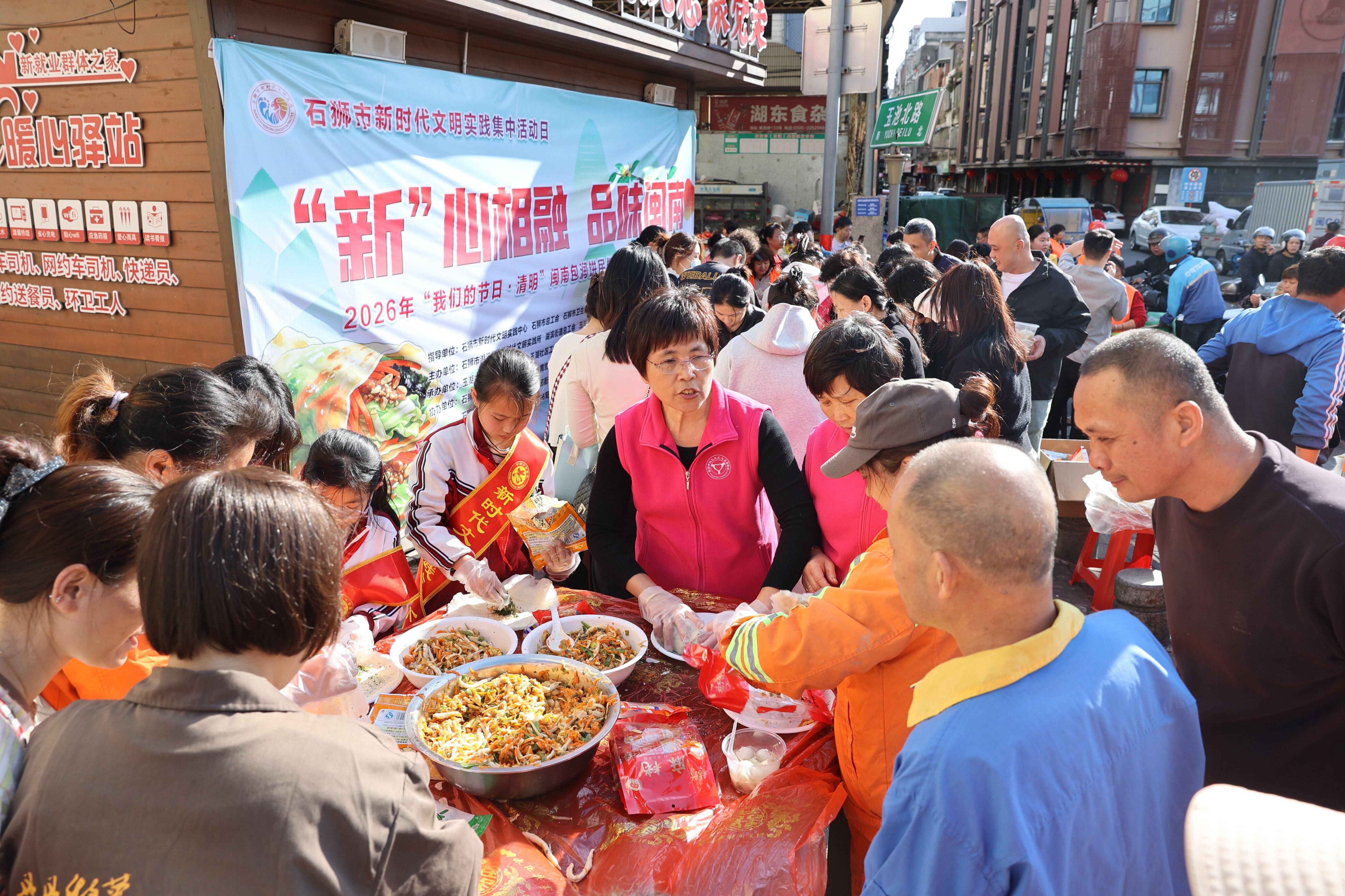 除了民俗体验环节,现场还开展了形式多样的志愿服务。工作人员为辛勤劳作的环卫工人送上暖心大礼包,向他们致以诚挚的问候与感谢,致敬城市美容师的默默付出。同时,志愿者携手开展爱国卫生运动,大家拿起工具,认真清理周边市场环境卫生,擦拭公共设施,整治卫生死角,以实际行动守护整洁宜居的社区环境。