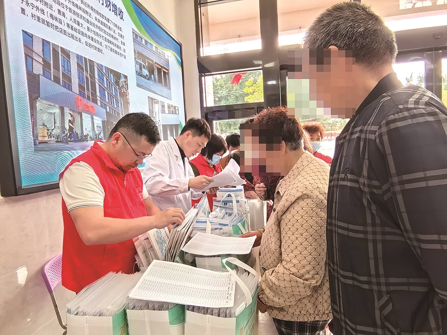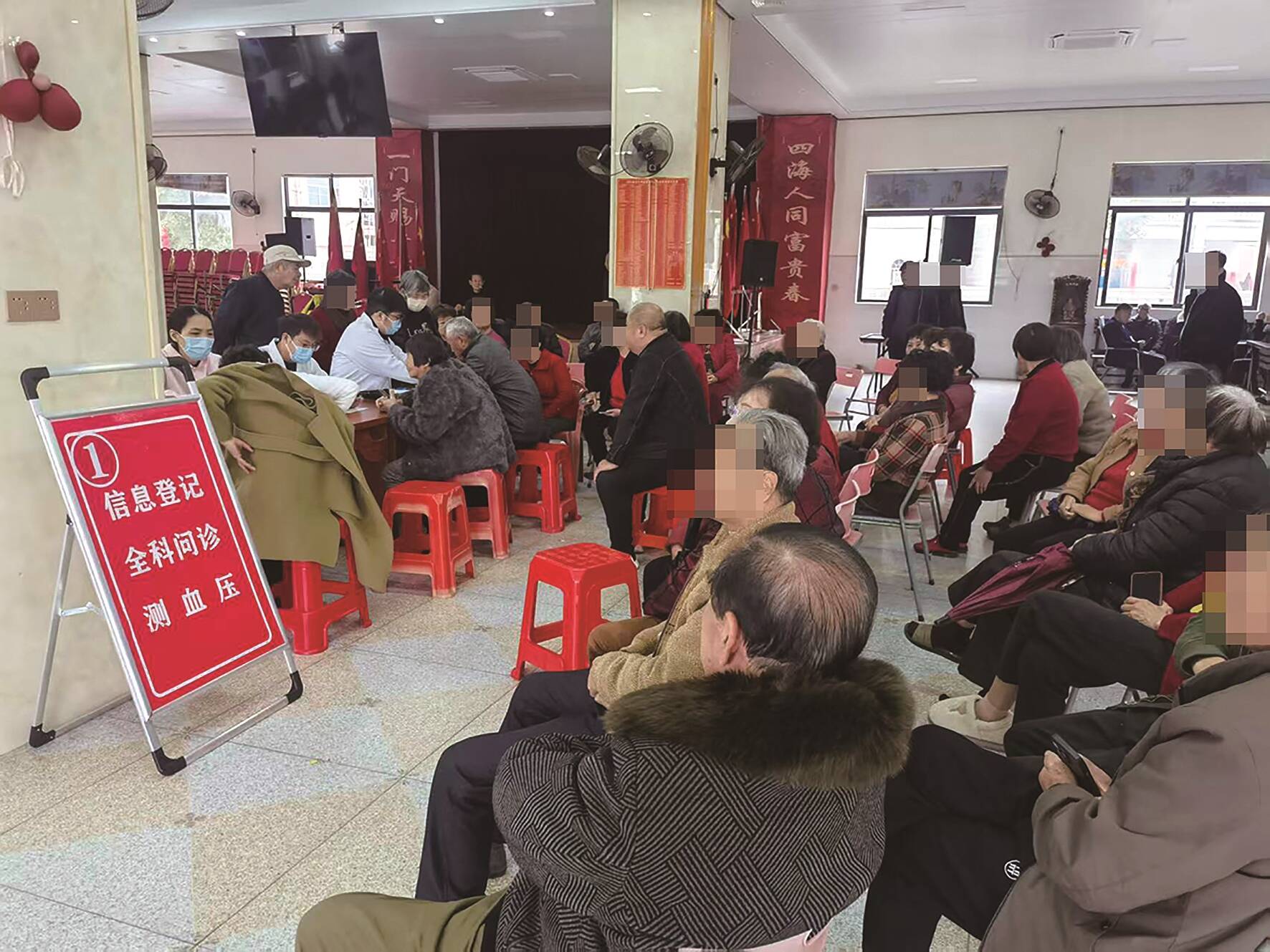 3月25日,在梅林村村委会,“一站式”体检报告解读服务现场拉开。镇卫生院全科医疗科、中医科及行政科的党员志愿者,将场地划分出了体检报告领取区、健康咨询区、用药指导区和家庭医生签约服务区。