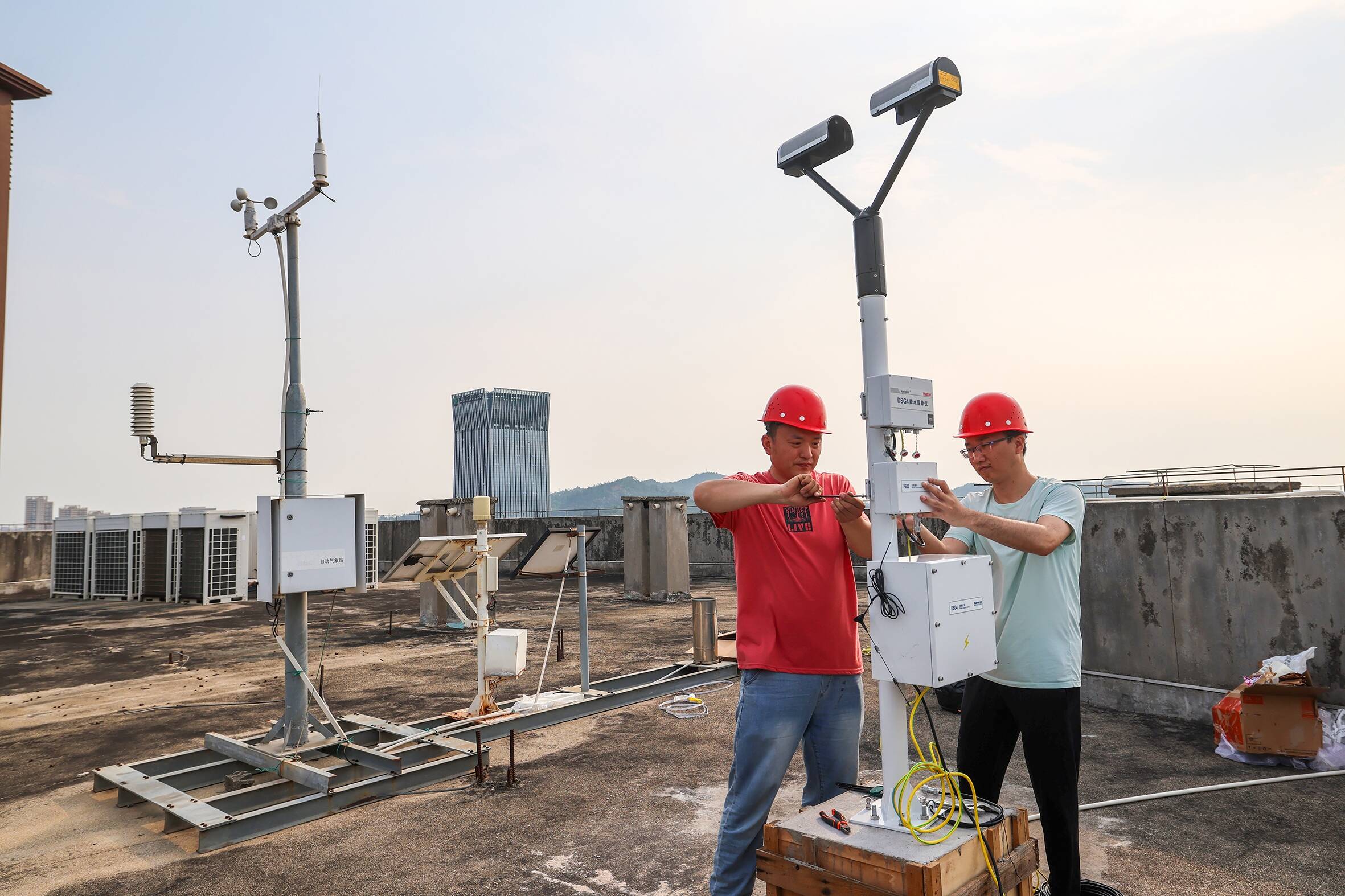 4月22日,在石狮市气象局大楼楼顶,安装人员正有条不紊地开展降水现象仪(雨滴谱仪)的安装调试工作,标志着石狮市首套降水现象仪正式落地,填补了我市降水现象自动化精准观测的空白,为气象防灾减灾、民生服务及海洋经济发展增添“科技利器”。