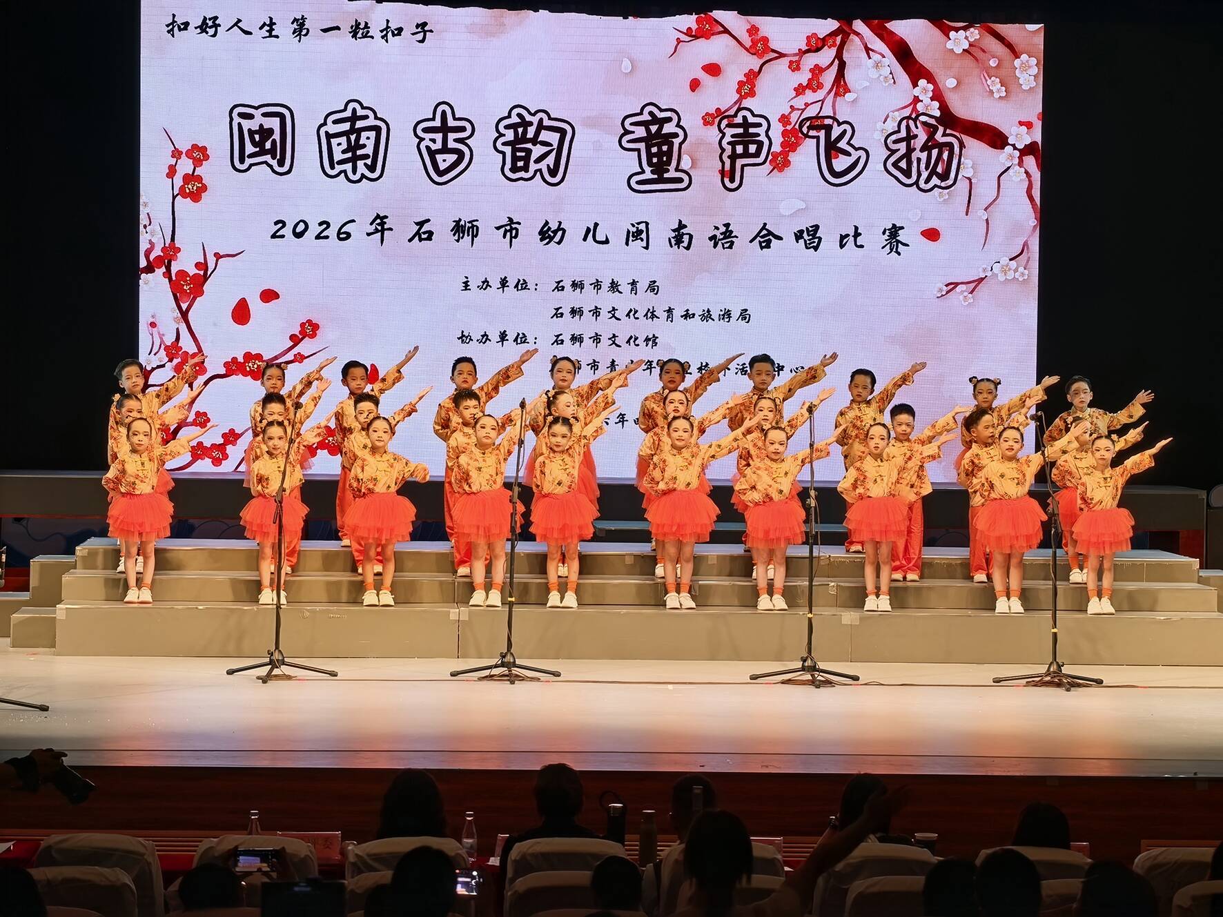 本次比赛由石狮市教育局、市文化体育和旅游局主办,市文化馆、市青少年学生校外活动中心协办,以“扣好人生第一粒扣子”为育人理念,为幼儿搭建接触、传承闽南文化的实践平台。舞台上,小歌手们身着整齐服饰,精神饱满、状态昂扬,以标准的闽南语演绎经典童谣,婉转的歌声与灵动的舞台表现相映成趣,熟悉的乡音旋律在音乐厅内回荡,赢得现场阵阵掌声。